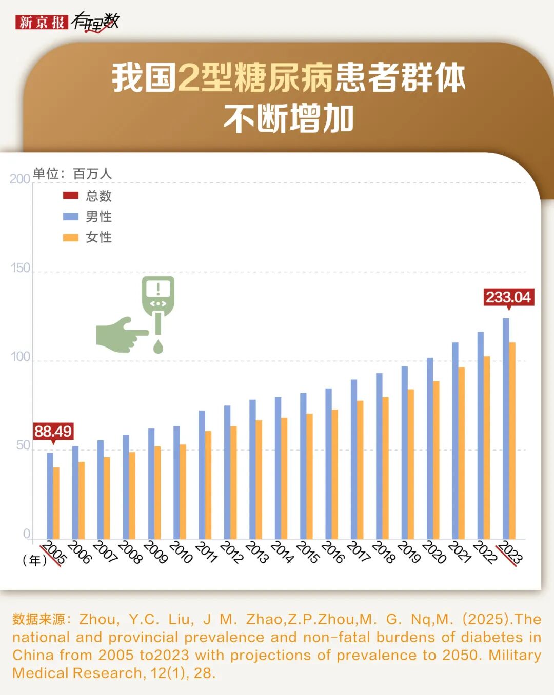 Core Insights - The rising prevalence of diabetes in China is alarming, with 233 million patients reported in 2023, marking a 163% increase since 2005, and affecting approximately 15.88% of the population [1][4][7] - The incidence of type 2 diabetes among individuals aged 15-39 is growing at a rate three times higher than the overall population, indicating a concerning trend of younger individuals being diagnosed [1][4][11] Summary by Sections Prevalence and Demographics - As of 2023, China has 233 million diabetes patients, accounting for 1/4 of the global diabetes population, with a prevalence rate of 15.88% [1][4] - The standardized incidence rate of diabetes is projected to rise linearly, reaching 16.15% by 2030, 21.52% by 2040, and 29.10% by 2050 if no measures are taken [4][11] Young Population Impact - The incidence of new type 2 diabetes cases in the 15-39 age group has consistently outpaced the overall growth rate from 2017 to 2021 [4][11] - The diabetes prevalence in the 10-14 age group is increasing at an annual rate of 3.88%, indicating a worrying trend among younger populations [7] Lifestyle Factors - Type 2 diabetes is primarily linked to lifestyle factors such as poor diet, lack of exercise, and obesity, with 90% of diabetes patients in China diagnosed with this type [7][11] - The average sedentary time for individuals in China is around 9 hours per day, with nearly one-third of the population not engaging in sufficient physical activity [15] Regional Disparities - There is a notable regional disparity in diabetes prevalence, with northern regions like Beijing and Tianjin exceeding 20%, while areas like Tibet and Guangxi report rates below 10% [16] - The relationship between economic development and diabetes prevalence is evident, with higher Human Development Index (HDI) regions showing significantly higher rates of diabetes [16] Dietary Habits - The dietary preferences of the Chinese population, particularly among the youth, lean heavily towards high-calorie, high-fat foods, while intake of essential nutrients like fruits and vegetables is insufficient [12][19] - A report indicates that over half of the takeout orders in major cities consist of high-carb, high-fat, and meat-heavy dishes, contributing to unstable blood sugar levels [19][22] Awareness and Management - Approximately 350 million individuals in China are estimated to be pre-diabetic, significantly outnumbering those diagnosed with diabetes [22] - Despite an increase in awareness, with 52.3% of diabetes patients now aware of their condition, the treatment control rate remains below 40% [22]