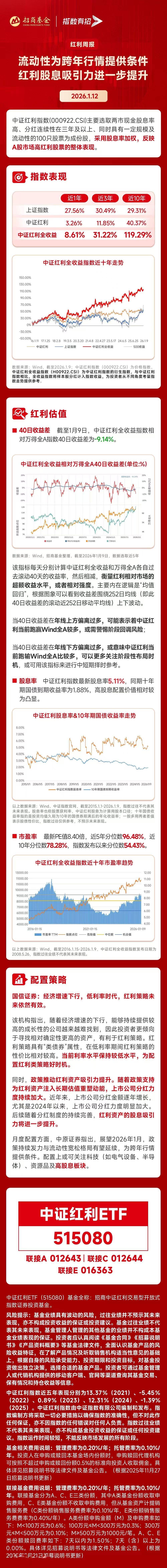 1月13日早盘,三大指数集体跳水,上证指数17连阳站上4100点后高位震荡。板块来看,近期较为热门的商业航天、半导体、AI应用等表现较 弱,高成长与高股息方向"跷跷板"效应显现,中证红利ETF(515080)盘中微涨,日K冲击三连阳。 近期市场连续震荡上行,从2024年"9·24"至今主要指数屡刷新高。回顾A股历史,似乎并未出现类似连续3年"提估值"的情况,那么2026年能否 打破?后续A股能否在4000点上方"更上一层"? 广发证券认为,2026年A股估值有望打破历史规律、连续3年提升。 首先,2024-2025年与过往相比估值拔升幅度较为克制,国际竞争格局变化也为背后的估值对比提供安全边际。其次,受益于新兴产业利润占 比提升、PPI下行放缓、AI投资继续高增等多重因素,A股整体ROE可能再次回升。最后,监管资金、保险资金、银行理财、中高净值存款搬 家这4类增量资金也较为确定、构筑慢牛基础。 但具体到配置方面,考虑到部分科技板块估值、拥挤度双高,投资者当下或可考虑通过大科技+高股息"哑铃"配置,用多元化布局穿越市场波 动。 数据显示,两市标杆品种中证红利ETF(515080)跟踪中证红利指数。截至1月9日, ...
