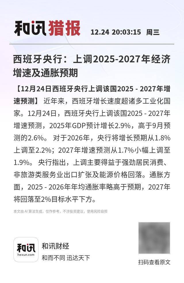 西班牙央行:上调2025-2027年经济增速及通胀预期