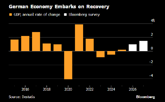 德国经济自2022年以来首年实现增长,政府大规模支出助力该国摆脱了持续已久的工业衰退。 责任编辑:刘明亮 责任编辑:刘明亮 德国经济自2022年以来首年实现增长,政府大规模支出助力该国摆脱了持续已久的工业衰退。 在连续两年经济萎缩后,2025年国内生产总值增长0.2%,与接受彭博调查分析师的预测中值一致。第 四季度实现了同等幅度的增长。 在连续两年经济萎缩后,2025年国内生产总值增长0.2%,与接受彭博调查分析师的预测中值一致。第 四季度实现了同等幅度的增长。 ...
