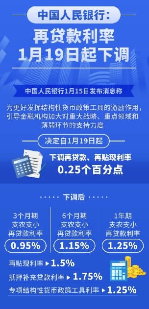 新华社北京1月15日电(记者吴雨)中国人民银行1月15日宣布,自2026年1月19日起,下调再贷款、再 贴现利率0.25个百分点。这意味着,银行从中国人民银行"借钱"将更便宜,有助于提升重点领域信贷投 放的积极性,进一步助力经济结构转型优化。 ...