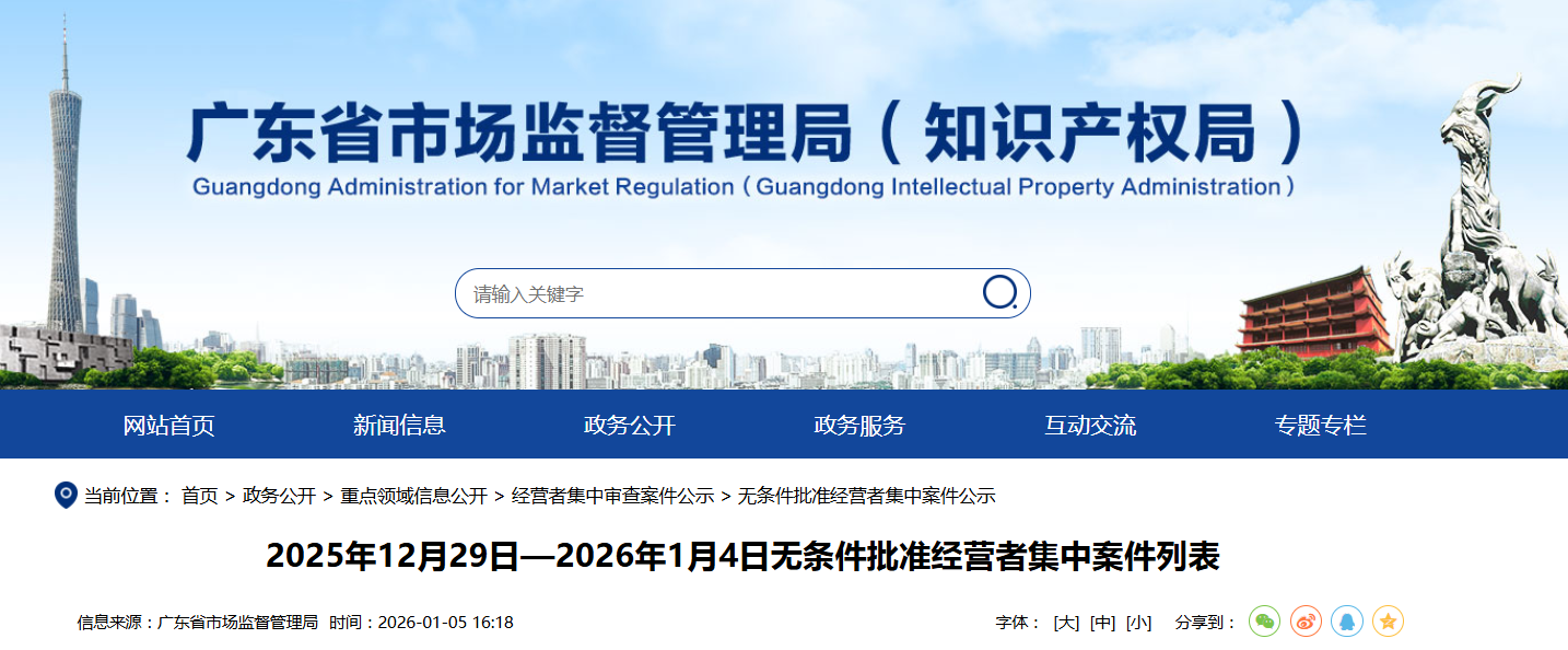 Core Viewpoint - The document lists the unconditional approval of several merger and acquisition cases involving various companies, indicating ongoing consolidation activities in the market [1]. Group 1: Mergers and Acquisitions - Case 1: Chengjiu Limited's acquisition of equity in Guangzhou Judai Investment Development Co., Ltd. was approved on January 6, 2026 [1]. - Case 2: Guangzhou Light Industry and Trade Group Co., Ltd. acquired equity in Cangzhou Mingzhu Plastic Co., Ltd., also approved on January 6, 2026 [1]. - Case 3: Guangzhou Dongjin Industrial Park Investment Development Co., Ltd. and COSCO Shipping Logistics Supply Chain Co., Ltd. established a new enterprise, approved on January 9, 2026 [1].