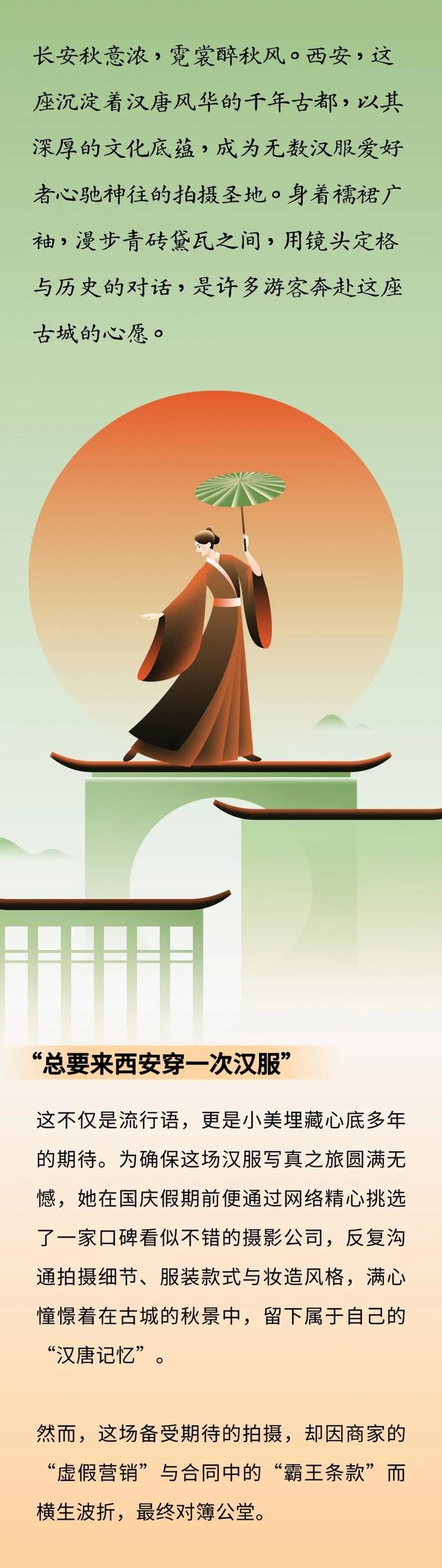 长安秋意浓,霓裳醉秋风。西安,这 座沉淀着汉唐风华的千年古都,以其 深厚的文化底蕴,成为无数汉服爱好 者心驰神往的拍摄圣地。身着襦裙广 袖,漫步青砖黛瓦之间,用镜头定格 与历史的对话,是许多游客奔赴这座 古城的心愿。 "总要来西安穿一次汉服" 这不仅是流行语,更是小美埋藏心底多年 的期待。为确保这场汉服写真之旅圆满无 憾,她在国庆假期前便通过网络精心挑选 了一家口碑看似不错的摄影公司,反复沟 通拍摄细节、服装款式与妆造风格,满心 憧憬着在古城的秋景中,留下属于自己的 "汉唐记忆"。 然而,这场备受期待的拍摄,却因商家的 原告小美与被告西安某摄影公司于2025年9月25日通过微信沟通汉服写真拍摄事宜,后双方于2025年10 月1日签订写真合同,约定商家为小美拍摄汉服写真,提供妆造及服装,服装套数:共计4套,每套精修 16张,总计金额1299元,拍摄时间需提前24小时确认。签约当日,小美全额支付了服务费。 对消费者:筑牢维权防线,理性守护权益 对经营者:摒弃霸王条款,坚守诚信底线 其后,小美在拍摄前发现,商家此前向其展示的摄影作品并非商家原创,涉嫌虚假营销,担忧拍摄效果 无法达标,小美随即提出解除合同并要求全额退 ...