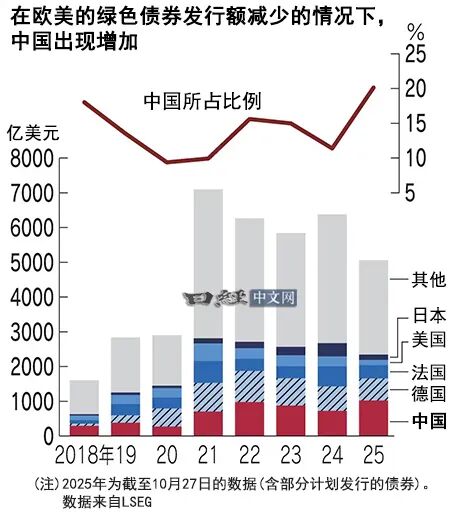 Core Viewpoint - China is seizing the opportunity to establish "green leadership" as the decarbonization efforts in Europe and the US face challenges, with a significant increase in green bond issuance reflecting this strategy [2][4][9]. Group 1: Green Bond Issuance - As of late October 2025, China's green bond issuance reached $101.8 billion, marking a 92% year-on-year increase and setting a historical record, accounting for 20% of the global total [4][5]. - The global green bond issuance for 2025 is approximately $506 billion, showing an 11% decline year-on-year, with China leading the way, followed by Germany at $63.7 billion and the US at $15.4 billion, which saw a 42% decrease [4][5]. - Major financial institutions in China, such as Agricultural Bank of China and Industrial Bank, have been key issuers of green bonds, with significant amounts raised for renewable energy and low-carbon projects [5][7]. Group 2: Economic Context and Strategy - The ongoing downturn in the real estate sector has contributed to a slowdown in China's economic growth; however, green bond issuance remains robust as the government positions green industries as a pillar for economic growth [7][8]. - China's commitment to green industries is consistent, unlike in the US, where policies may shift with political changes, reinforcing the stability of green investments in China [7]. Group 3: International Standards and Attracting Foreign Investment - China is aligning its green bond standards with international benchmarks, such as the EU Taxonomy, to enhance credibility and attract foreign investment [8][9]. - The issuance of China's first green sovereign bond in London, which attracted significant interest from European and Middle Eastern investors, exemplifies efforts to draw overseas capital [9]. - Despite over 90% of green bonds being purchased by domestic investors, the Chinese government is actively working to increase foreign participation in its green bond market [9]. Group 4: Global Impact and Challenges - China's advancements in renewable energy, particularly in photovoltaic capacity, position it as a key player in global decarbonization efforts, especially as the US faces setbacks in its climate policies [7][9]. - The rise of China's green bond market, as the largest globally, is crucial for achieving international climate goals, although it has raised concerns in the West regarding potential trade barriers and tariffs on Chinese green products [9].