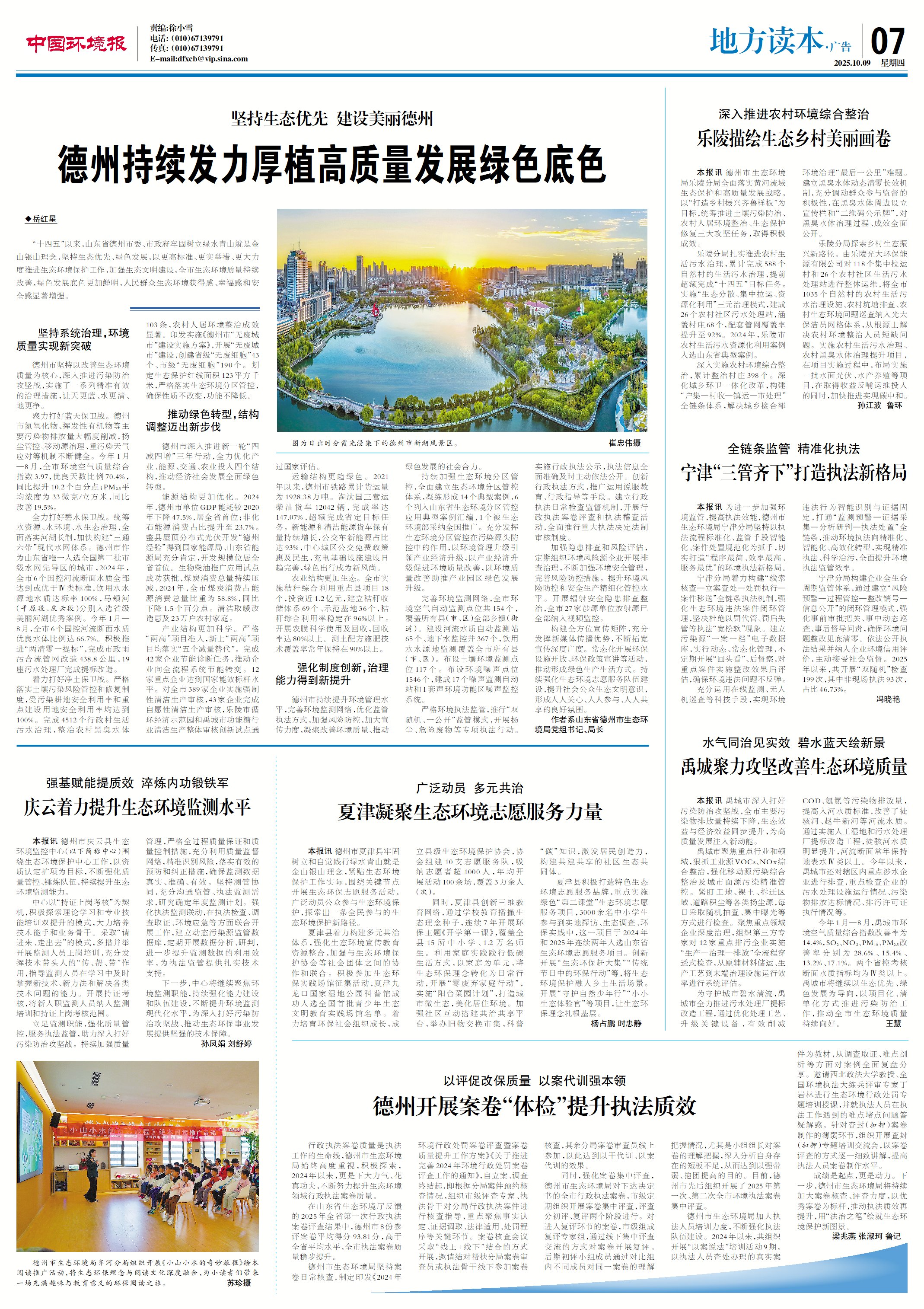 责编:徐小雪 电话:(010)67139791 传真:(010)67139791 E-mail:dfxcb@vip.sina.com 坚持生态优先 建设美丽德州 别持续发力厚植高质量发 ◆岳红星 "十四五"以来,山东省德州市委、市政府牢固树立绿水青山就是金 山银山理念,坚持生态优先、绿色发展,以更高标准、更实举措、更大力 度推进生态环境保护工作,加强生态文明建设,全市生态环境质量持续 改善,绿色发展底色更加鲜明,人民群众生态环境获得感、幸福感和安 全感显著增强。 坚持系统治理,环境 质量实现新突破 德州市坚持以改善生态环境 质量为核心,深入推进污染防治 攻坚战,实施了一系列精准有效 的治理措施,让天更蓝、水更清、 地更净。 聚力打好蓝天保卫战。德州 市氮氧化物、挥发性有机物等主 要污染物排放量大幅度削减,扬 尘管控、移动源治理、重污染天气 应对等机制不断健全。今年1月 -8月,全市环境空气质量综合 指数 3.97,优良天数比例 70.4%, 同比提升 10.2个百分点;PM2s平 均浓度为33微克/立方米,同比 改善19.5%。 全力打好碧水保卫战。统筹 水资源、水环境、水生态治理,全 面落实河湖长制,加快构 ...