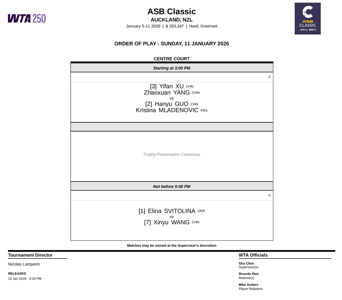 三项网球赛事决赛开打。其中,奥克兰站王欣瑜再冲首冠,联合杯波兰瑞士上演强强对话,布里斯班站萨巴伦卡力争卫冕。 具体赛程预告如下,以下安排均为北京时间 ↓ WTA250奥克兰站 10:00徐一璠/杨钊煊 vs 郭涵煜/穆拉德诺维奇 不早于12:00斯维托丽娜 vs 王欣瑜 联合杯 14:30斯瓦泰克 vs 本西奇 不早于16:00胡尔卡奇 vs 瓦林卡 随后斯瓦泰克/胡尔卡奇 vs 本西奇/瓦林卡 UNITED CUP ORDER OF PLAY - Sunday, 11 January 2026 | | KEN ROSEWALL ARENA Sydney | | | --- | --- | --- | | | Matches Start At: 5:30 pm | | | | Iga SWIATEK (POL) [9] | | | 1 | NS | | | | Belinda BENCIC (SUI) [16] | | | | Not Before 7:00 pm | | | | Hubert HURKACZ (POL) [9] | | | 2 | VS | | | | Stan WAWRINKA (SUI) ...