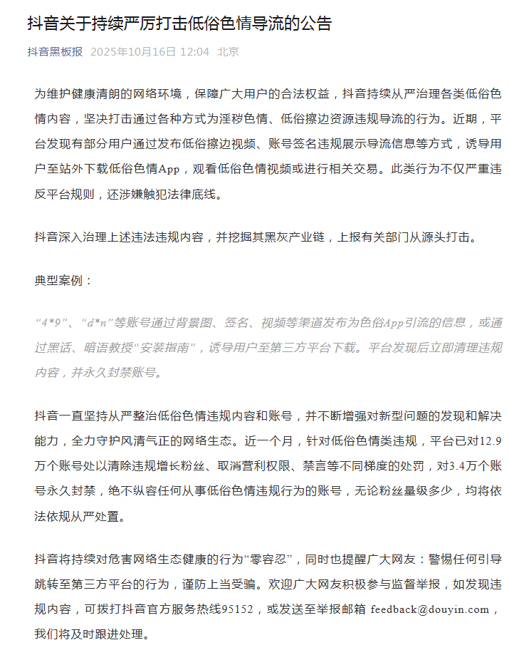 来源:抖音黑板报微信 8月29日,抖音发布关于持续严打"色情低俗"的公示。其中提到, 抖音严禁用户以各种手段传播淫秽色 情内容 ,严禁通过短视频、直播、群聊、简介等任何形式,发布违法违规二维码、链接、联系方式等 信息,诱导用户至第三方平台进行色情相关交易或在线下提供色情服务。 平台一旦发现涉嫌违法犯罪 的线索,将主动向公安机关报案。 移送公安机关案件2:直播间展示色情导流二维码被刑拘 平台发现某主播在直播间简介存在性暗示,直播间内正常互动,当人气提升后,突然展示色 情导流二维码,引导观众下载"约炮"软件。平台识别后,立即封禁账号直播权限并将线索上 报公安机关,犯罪嫌疑人因涉嫌非法利用信息网络罪被依法刑事拘留。 移送公安机关案件3:组织主播站外传播淫秽视频,18人被刑拘 抖音关于持续严打 "色情低俗" 的公示 为切实维护健康网络环境,保障广大网民的合法权益,抖音一直坚持从严整治各类色情低俗 行为。依据《中华人民共和国网络安全法》《互联网信息服务管理办法》《网络信息内容生 态治理规定》等法律法规,及《抖音社区自律公约》《抖音直播行为规范》等平台规则,结 合用户反馈与社会关切,平台严厉打击淫秽色情及其引流信息,深入 ...