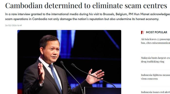 柬埔寨首相洪玛奈:将继续打击电诈中心 中新网2月27日电 综合外媒报道,柬埔寨首相洪玛奈2月25日重申,柬埔寨政府将继续努力打击电诈中 心,保护经济发展。 另据法新社报道,洪玛奈还谈及柬泰关系,他表示柬方希望缓和与泰国之间的局势,寻求和平解决冲 突。"我们不想让局势升级。我们希望缓和局势。我们希望和平共处。"洪玛奈说。 2月18日,柬国务大臣兼国家打击网络诈骗委员会秘书长柴西纳列向26国驻柬使节等通报打击电信诈骗 进展,表示打击电诈是柬第七届王国政府持续推进的核心国家战略,并非阶段性行动。目前,柬方已建 立由首相洪玛奈亲自领导的国家级打击网络诈骗机制,强化跨部门协同执法,提升整治成效。 来源:中国新闻网 图片来源:越通社报道截图 据越通社报道,洪玛奈在访问比利时布鲁塞尔期间接受媒体采访时表示,诈骗活动不仅损害了国家声 誉,也破坏了合法经济发展。 洪玛奈将网络诈骗描述为"黑市经济"的一部分,称其损害了旅游业和外国投资,以及柬埔寨的形象,这 是国家必须根除的问题。 编辑:王永乐 广告等商务合作,请点击这里 本文为转载内容,授权事宜请联系原著作权人 中新经纬版权所有,未经书面授权,任何单位及个人不得转载、摘编或以其 ...