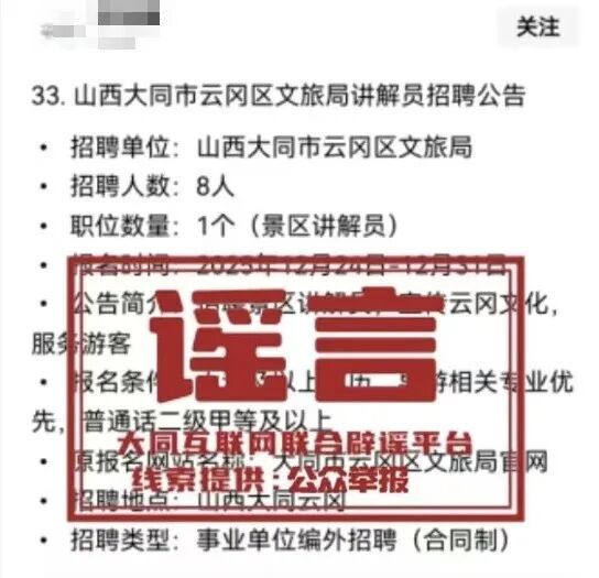 “山西大同市云冈区文旅局讲解员招聘公告”?官方辟谣