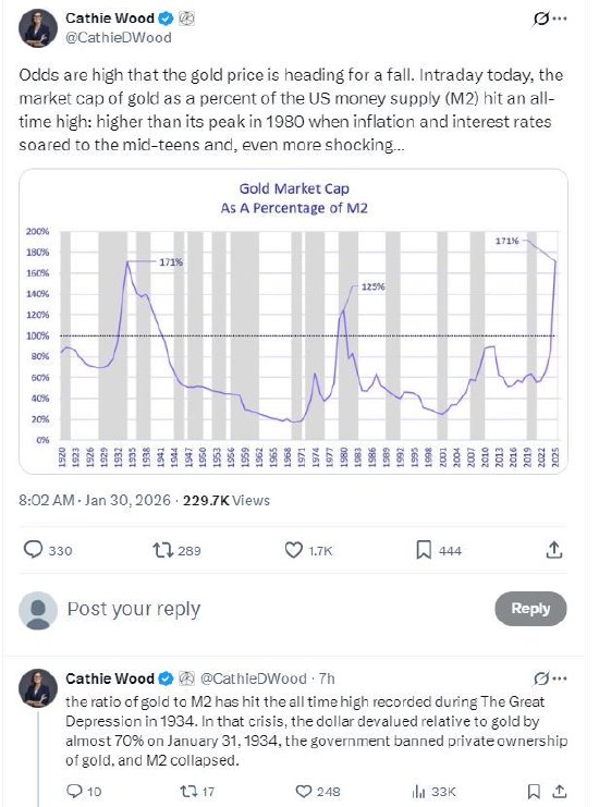 伍德表示:"金价下跌的可能性很高。今天盘中,黄金市值占美国货币供应量(M2)的比例创下历史新 高:高于1980年的峰值,当时通胀率和利率飙升至15%以上,而且更令人震惊的是……黄金与 M2 的比 率已达到自 1934 年大萧条时期以来的最高值。在那场危机中,1934 年 1 月 31 日,美元相对于黄金贬 值了近 70%,政府禁止了私人持有黄金的行为,而 M2 则大幅缩水。" 方舟投资管理公司创始人凯茜·伍德周四在社交平台X上发布一连串帖子,对黄金的泡沫风险发出警告。 伍德接着写道:"今天的美国经济与上世纪70年代两位数通胀高企的时期,或是上世纪30年代通缩萧条 的时期截然不同。诚然,外国央行多年来一直在减少对美元的依赖;然而,10年期美国国债收益率在 2023年末达到5%的峰值,而现在已降至4.2%。" 伍德总结称:"虽然抛物线式的走势往往会将资产价格推高到超出大多数投资者预期的水平,但这种惊 人的飙升通常发生在周期的末期。我们认为,当前的泡沫不在人工智能领域,而是在黄金领域。美元的 上涨可能会戳破这个泡沫,就像 1980 年至 2000 年期间那样,当时黄金价格下跌了超过 60%。" 伍德表示:"金价下跌 ...