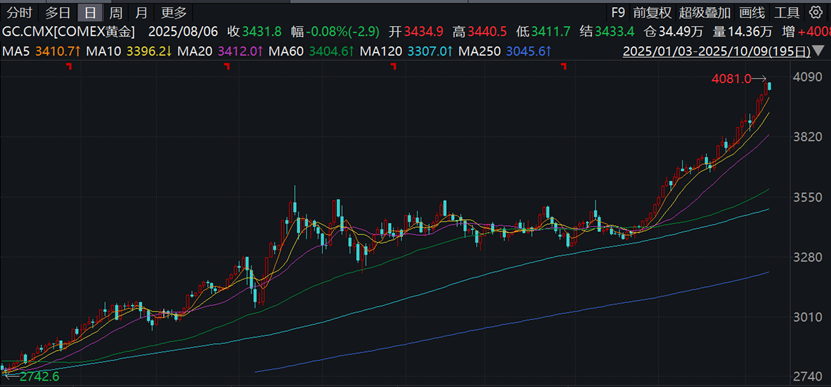 国庆假期期间,国际金价持续攀升。截至10月7日12时,COMEX黄金期货价格最高触及4000.1美元/盎司,创下历史新高。现货黄金(伦敦金)开盘价为 3958.71美元/盎司。 中经记者 郝亚娟 夏欣 上海 北京报道 从国内市场看,黄金珠宝品牌的足金饰品价格同样延续上涨态势。10月7日,周大福足金饰品挂牌价为1155元/克,较10月1日的1129元/克上调26元/克。 央行数据显示,黄金储备也在稳步增加。10月7日,中国人民银行公布的数据显示,9月末中国黄金储备达7406万盎司,较8月末增加4万盎司,为连续第11 个月增持。 对于后市,机构普遍认为金价仍具上行空间。西部证券策略研究团队认为,重启降息意味着美联储独立性受损,未来美联储独立性会持续受到损害,黄金 的储备价值将进一步彰显,目前处于第3波主升浪行情早期。 高盛预计,由于新兴市场央行可能会继续将储备进行结构性多元化配置,增加黄金持有量,2025年和2026年央行的黄金购买量将平均达到80吨和70吨,将 2026年12月黄金价格预测上调至每盎司4900美元(此前预测为4300美元)。 首饰金多次上调价格 国庆假期,金价延续上涨态势。《中国经营报》记者走访 ...
