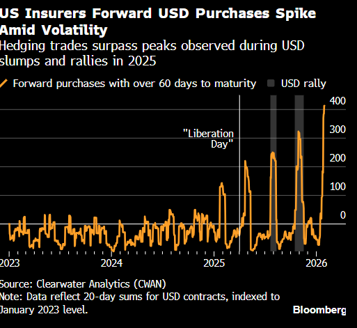 Core Insights - The article highlights a significant increase in U.S. insurance companies purchasing dollar forward contracts for hedging purposes due to heightened volatility in the dollar since the beginning of the year [1][3][5] - According to Clearwater Analytics Holdings Inc., the scale of these purchases has surpassed the peak levels seen last year when the dollar fell after Trump's "liberation day" tariffs announcement [1][3] - Matthew Vegari, the research director at Clearwater, noted that while the dollar has experienced larger declines in the past, the trading activity of U.S. insurance companies this year is particularly noteworthy, indicating a decisive move to hedge against further dollar weakness [1][3] Summary by Category Dollar Volatility and Hedging Activity - The volatility of the dollar has increased significantly in 2025, driven by Trump's trade policies and pressure on the Federal Reserve, prompting U.S. insurance companies to enhance their hedging measures beyond previous years [3][5] - Insurance companies had previously increased their forward contract purchases during periods of dollar strength in the summer and fall, but the current hedging activity is described as much more aggressive [3][5] Research Basis - Clearwater's research is based on a representative sample of U.S. insurance companies, all of which manage assets exceeding $500 million [3][5]