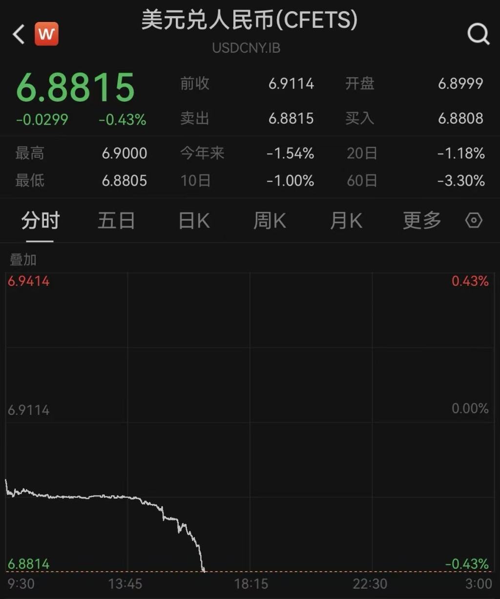 创出新高!在岸、离岸人民币汇率均升破6.87关口|快讯