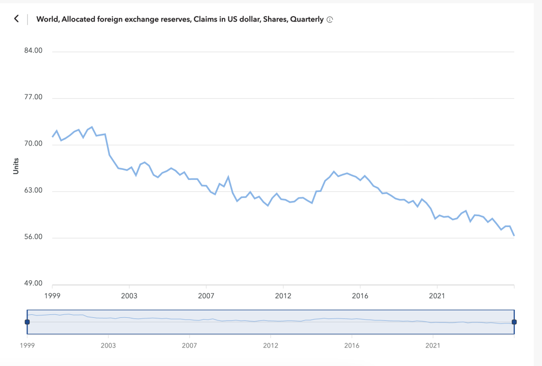 美元在全球央行外汇储备中的占比正在逐渐下降,当前已降至三十年来最低水平。 国际货币基金组织(IMF)日前发布的全球外汇储备货币构成数据(COFER)显示,今年二季度末,美元在全球外汇储备中占比56.32%,较一季度末下 降了1.47个百分点。这一比例已跌至1995年以来最低水平。 对于美元占比降低这一现象,IMF同步发布文章称,汇率变动是主要因素。"如果不考虑汇率变动的因素,第二季度美元在全球外汇储备中的占比保持稳 定。" 回顾上半年,美元指数跌幅超过10%,创下1973年以来最大跌幅。其中,第二季度,美元兑欧元贬值7.9%,上半年贬值10.6%;美元兑瑞士法郎贬值 9.6%,上半年贬值超过11%。IMF报告称,这是美元兑瑞士法郎十多年来上半年表现最差的一次。 "这意味着,即便各国央行未对其投资组合做出任何调整,以美元计价的非美元资产价值也有所上升,从而导致美元资产所占份额相应减少。"IMF认为, 今年4月至6月,美元在全球央行储备中份额约92%的降幅由汇率因素引起。 欧元也是一个典型案例。IMF认为,在某些情形下,货币升值能够抵消其在全球央行储备中整体持有量的下降。比如,尽管今年第二季度欧元在全球央行 官方 ...
