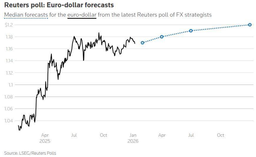 来源:金十数据 根据路透社调查,2026年初外汇策略师对美元的展望依然看跌。基于对美联储独立性的持续担忧以及利率可能下调的预 期,预计美元到年底将小幅贬值。 去年,美元兑一篮子主要货币下跌近10%,创下2017年以来最弱表现。投资者权衡了自大萧条以来最高水平的美国关税、劳 动力市场疲软以及未来几年计划中的数万亿美元额外借款所带来的风险。 市场也聚焦于围绕央行自主权的问题以及谁将接替任期于5月结束的美联储主席鲍威尔,预计相关声明将很快公布。 在1月5日至7日进行的路透社调查中,外汇预测机构的主流观点几乎未变,均认为美元的下跌趋势将持续。调查中值显示, 欧元预计将每季度上涨约1%,在年中兑美元达到1.19,年底达到1.20。在71位参与者中,仅有17%(12位)预测欧元到2026 年底会从当前水平走弱。 尽管如此,政策制定者已示意将暂停降息以评估后续数据,这突显了官员之间的分歧:一些官员担心刺激仍高于2%目标的 通胀,而另一些则担心在不进一步降息的情况下就业岗位会继续流失。 汇丰银行全球外汇研究主管保罗·麦克尔(Paul Mackel)表示,特朗普政府财政扩张的影响"已经开始显现",而去年关税政 策的影响——给从 ...