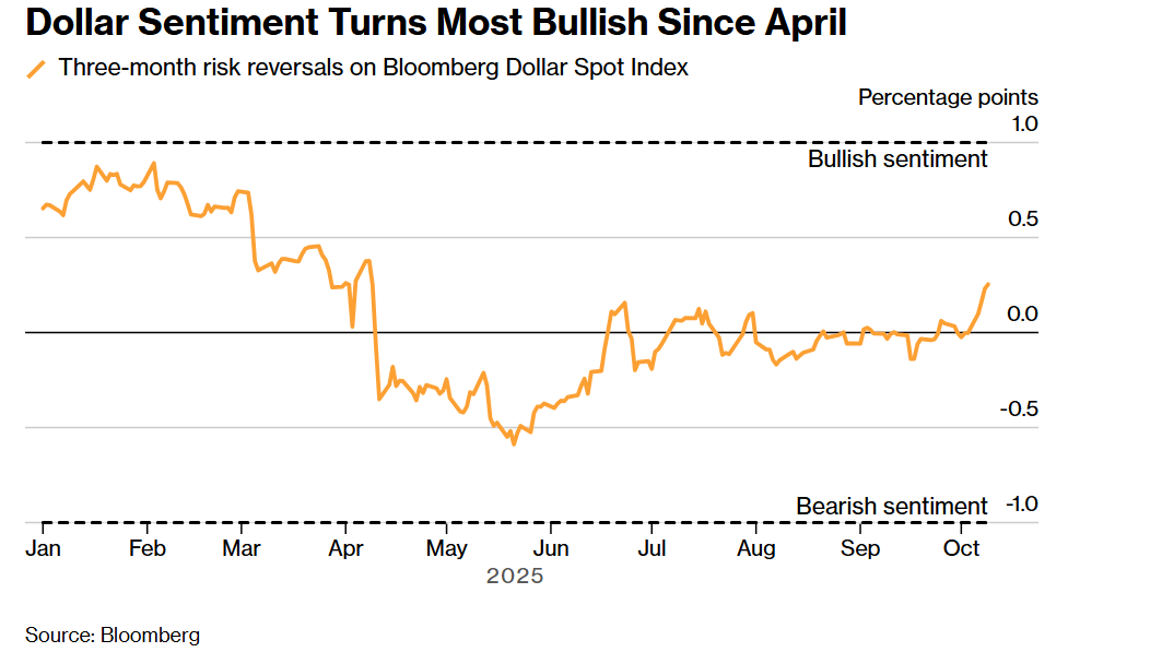 AI播客:换个方式听新闻 下载mp3 音频由扣子空间生成 在日交易量达9.6万亿美元的外汇市场上,做空美元是今年的主流交易策略,但这一押注正开始遇挫。 尽管美国政府停摆持续,作为全球主要储备货币的美元仍升至约两个月高位。亚欧两地交易员表示,对冲基金正增加期权押注,认为美元对多数主要货币的 反弹势头将延续至年底。 海外市场动态是关键推手——欧元与日元本月大幅下跌;与此同时,美联储官员呼吁对进一步降息保持谨慎的言论,也提升了美元的吸引力。 美元强势持续时间越长,对那些坚持看空美元、认为其将进一步下跌的投资者而言,损失就越惨重。看空阵营中不乏高盛集团、摩根大通与摩根士丹利等巨 头。 美国商品期货交易委员会(CFTC)最新数据显示,截至9月末,对冲基金、资产管理公司与商品交易顾问仍持有美元空仓。尽管空仓规模远低于年中峰值, 但如果美元继续升值,这些投资者仍可能面临巨大亏损。 若这一趋势延续,可能会对全球经济产生连锁反应:例如,加大其他央行宽松货币政策的实施难度、推高大宗商品成本,以及增加以美元计价的外债负担。 美元若快速反弹,还可能打乱今年最热门的部分交易——打压四季度新兴市场股票与债券的看涨预期,同时拖累美国出口企 ...