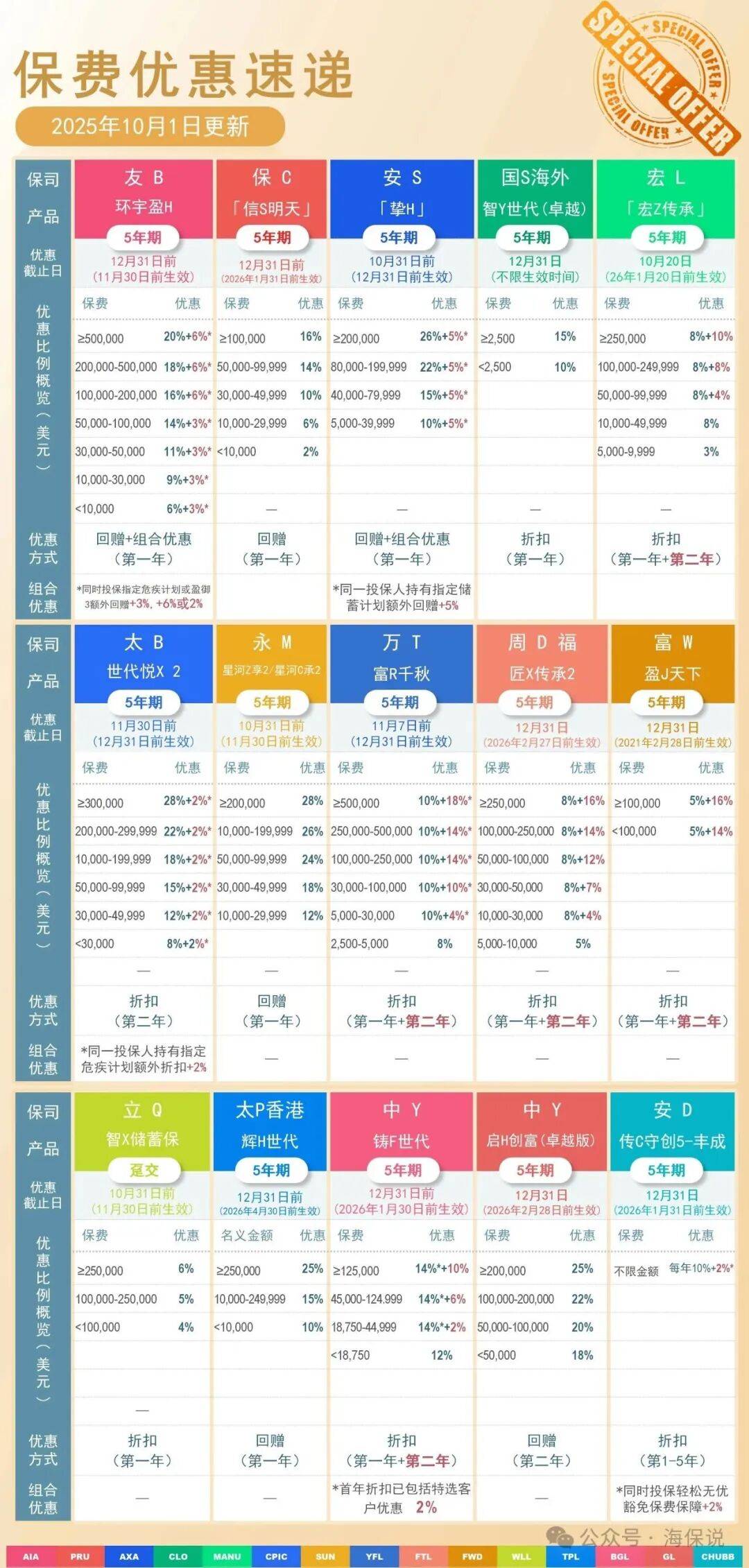 | 保司 | 友 B | | 保 C | 安 S | | 国S海外 | | 宏 L | | | --- | --- | --- | --- | --- | --- | --- | --- | --- | --- | | 产品 | 环宇 图H | | [信S明天] | | 望HI | 智Y世代(卓越) | | 宏Z传承 | | | | ਦੇਣ ਸ਼ਹਿ | | 5年期 | | २संदर्शन | 5年期 | | 5年期 | | | 优惠 截止日 | 12月31日前 | | 12月31日前 | | 10月31日前 | | 12月31日 | 10月20日 | | | | (11月30日前生效) | | (2026年1月31日前生效) | | (12月31日前生效) | | (不限生效时间) | (26年1月20日前生效) | | | | 保费 | 优惠 保费 | 优惠 | 保费 | 优惠 | 保费 | 优惠 保费 | | 优惠 | | FF | ≥500,000 | 20%+6%* ≥100.000 | 16% | ≥200.000 | 26%+5%* | ≥2,500 | 15% | ≥250,000 | 8% ...