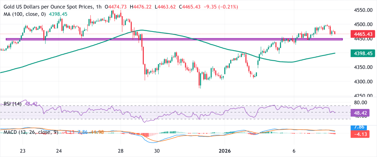 投资者正在静待美国关键经济数据的公布,以寻找下一轮市场方向的线索。包括本周五的非农就业报告(NFP)在内,这些数据可能为美联储的政策动向提 供参考,从而对美元及金价产生影响。近期公布的美国经济数据,如ADP私营部门就业、ISM服务业PMI和职位空缺报告,也可能带来短期波动。 技术面显示,黄金100小时简单移动平均线(SMA)位于现货价格下方并持续上升,表明在4400美元附近存在潜在支撑。MACD指标跌破信号线且维持在负 值区域,直方图呈现下行扩张,显示短期动能偏弱。RSI微跌至48.58,处于中性区间,反映价格在近期波动后趋于平衡。 短期来看,若动能企稳并出现改善,金价可能重拾上涨趋势。MACD若出现黄金交叉且RSI重返50上方,将为价格提供进一步支撑。反之,若动能未能改 善,金价可能在当前阻力区附近承压,并测试100小时SMA支撑。只要价格维持在均线上方,回调幅度可能有限;若收盘跌破均线,则下行空间可能扩大。 近期,黄金(XAU/USD)在连续两周强势上涨后,未能突破4,500美元心理关口。 周三亚市盘中,金价一度触及逾一周高点,但随后遭遇一定抛压。部分投资者在市场出现风险偏好时选择获利了结,使得金价上涨动 ...