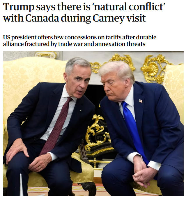中新网10月8日电据英国《卫报》报道,当地时间7日,美国总统特朗普在白宫与到访的加拿大总理卡尼 会谈,特朗普表示美国与加拿大之间存在"天然冲突"。 据报道,特朗普赞扬了双方在贸易协议上的进展,并表示愿意重新审视《美加墨贸易协定》或者寻 求"不同的协议",但在美国高额关税问题上几乎没有做出任何实质性让步。 特朗普还对卡尼表示:"我们希望加拿大发展得好",随后补充称:"但你知道,在某种程度上,我们也 希望拥有同样的商业利益。" 当被问及为何美国和加拿大未能达成贸易协议时,特朗普表示这是一个复杂的情况,并称:"我们有天 然冲突。" 不过卡尼对"冲突"一词表示异议。他表示:"我们在某些领域存在竞争,正是在这些领域,我们需要达 成一个可行的协议。但在更多领域,我们是更强大的整体,这才是我们关注的重点。" 曾担任加拿大驻美国大使、现任TD银行副董事长的弗兰克·麦肯纳表示,加拿大与美国的关系从未如此 糟糕。 报道同时指出,加拿大国内对自由贸易协定的未来感到担忧。卡尼希望在一些特定行业的关税上获得缓 解,但预期并不高。 (文章来源:中国新闻网) 图片来源:英国《卫报》报道截图 ...