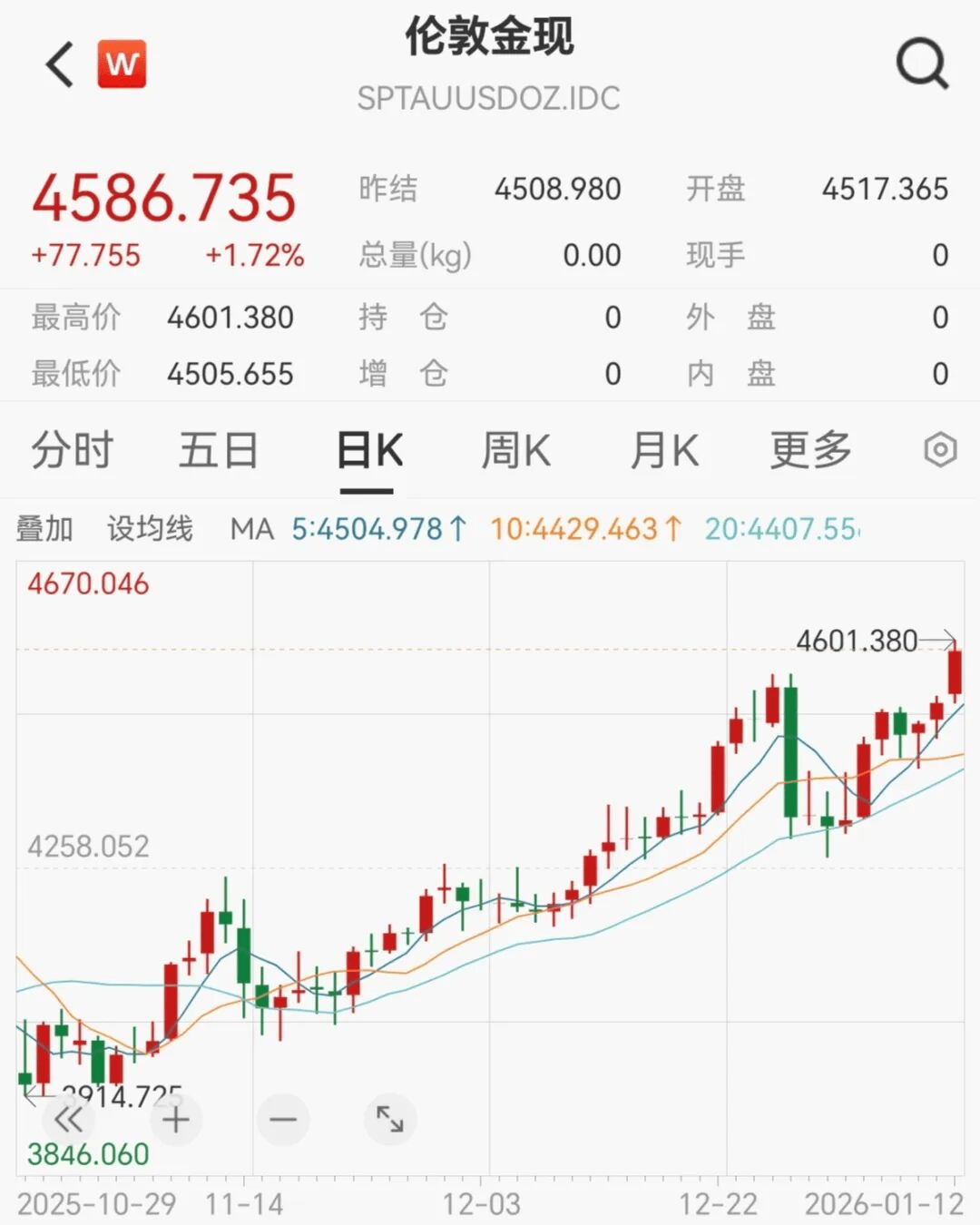 12日早盘,现货黄金(伦敦金现)强势拉涨,盘中突破2025年12月29日盘中创下的历史纪录(4550.520美元),再创新高。截至发稿,报4550.880美元/盎 司,涨0.93%。COMEX黄金期货同步上涨。 | < W | 伦敦金现 | | | | | Q | | | --- | --- | --- | --- | --- | --- | --- | --- | | | SPTAUUSDOZ.IDC | | | | | | | | 4550 880 "* | | | 4508.980 | 总量 | | | 0 | | +41.900 | +0.93% 开盘 | | 4517.365 | 现手 | | | 0 | | 最高价 | 4551.480 | 持 仓 | 0 | 4 | | | O | | 最低价 | 4505.655 | 增 仓 | 0 | 内 | | | O | | 分时 | 五日 | 日K | 周K | 月K | 甲零 | | | | 营加 | | | | 均价:0.000 | | | | | 4551 480 | | | | 0.94% | 卖一 4551.340 | | | | | | | ...