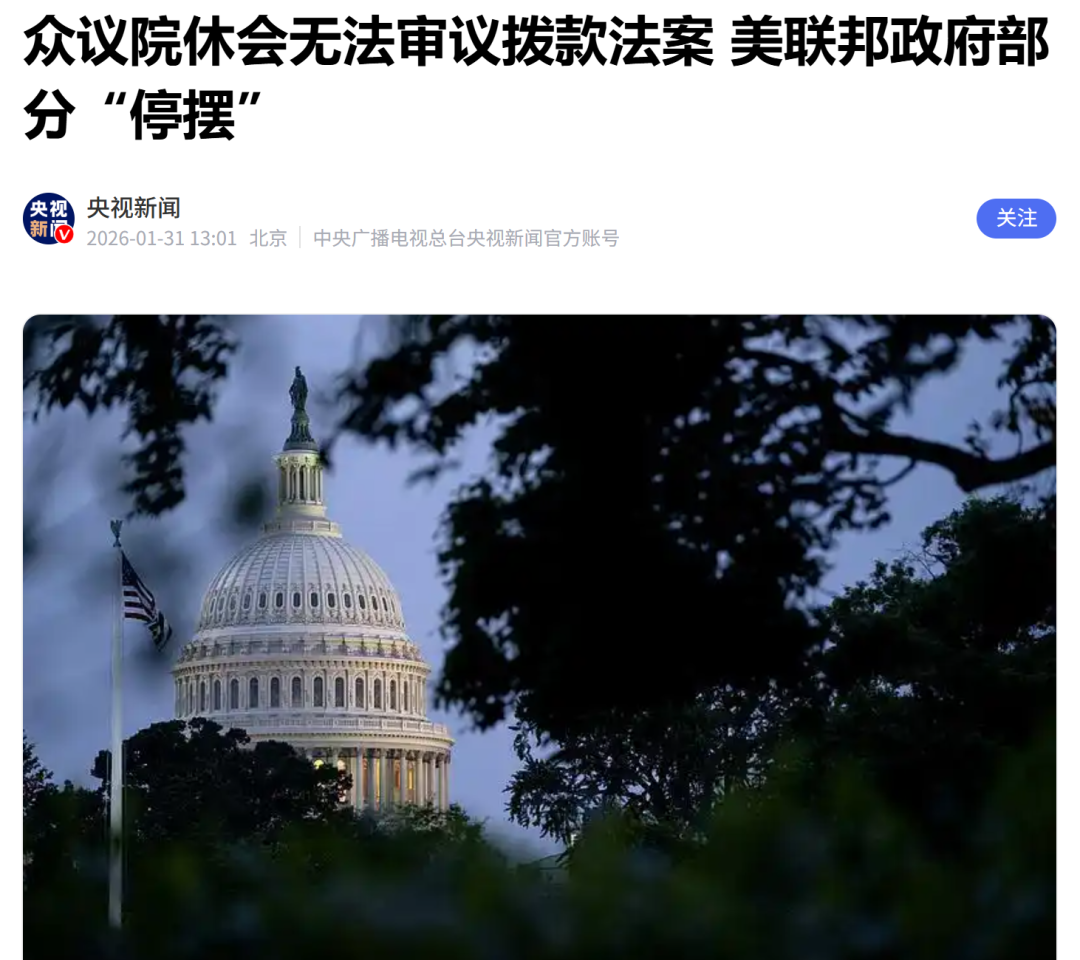 格隆汇1月31日|据央视,众议院休会无法审议拨款法案,美国联邦政府于当地时间1月31日零时进入技 术性、部分"停摆"状态。分析人士指出,尽管此次停摆预计持续时间不长,但仍再次凸显美国财政政治 的结构性困境。近年来,临时拨款、短期延期和边缘化停摆已成为国会预算博弈的常态,政府运作频繁 受到政治分歧掣肘。目前,市场普遍认为此次技术性停摆对金融市场和经济运行的直接冲击有限,但如 果国会后续谈判再度受阻,不排除停摆时间延长、影响范围扩大的风险。 ...