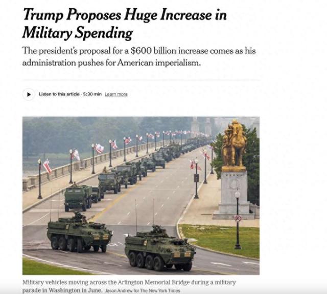 约时报》报道截图 中国青年报客户端讯(中青报·中青网记者 赵婷婷)美国总统特朗普近日提议将美国2027年国防预算提 高至1.5万亿美元。英国《金融时报》、美国《纽约时报》及"政治"新闻网等媒体称,此举或将推动美 国在委内瑞拉及更多地区的霸权主义行径。 美国《纽 《金融时报》指出,特朗普在第二任期内愈发频繁地动用军事手段实现外交政策目标。半岛电视台评论 称:"对委内瑞拉的军事行动似乎激化了美国总统的好战情绪,而这位总统不久前才获得了2025年国际 足联和平奖。"美国福克斯新闻频道前主持人塔克·卡尔森直言,美国正朝着可能引发"世界大战"的方向 发展。 特朗普在社交平台上发文称,提高军费开支"将帮助美国打造'梦想军队',更重要的是,无论面对何种 敌人,此举都能确保我们的安全"。他并未明确表示这些军费将用于哪些武器项目和军种。《纽约时 报》分析称,美国正在勾勒一个"新世界秩序的愿景":只要认定符合美国国家利益,美国便可自由地推 翻外国政府,夺取外国的领土和资源。 不到一周的时间内,特朗普暴露了其图谋委内瑞拉石油资源的野心,宣称"重塑西半球"战略,威胁要武 力吞并格陵兰岛,要求美国退出66个国际组织…… 卡塔尔半岛电视 ...