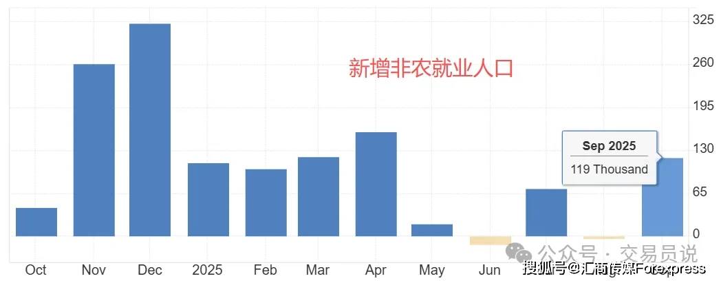 ATFX汇评:美国9月非农就业报告大超预期,新增非农就业人口冲高至11.9万人,远高于市场预期的5万人,高于前值2.2万人。美国副总统万斯表示,预 计市场将因非农就业报告而"疯狂"。不过,从美指、黄金白银的表现来看,资金面对该数据的反应较为平淡。美元指数当日波幅0.09%,黄金白银的波幅 分别为0.15%、0.98%。比较特殊的是美元指数,在数据发布的前一天收出长阳线,可能有"聪明资金"提前入市布局。 ▲ATFX图 历史数据看,9月份11.9万人的新增非农就业人口虽然高于前值和预期值,但相比5月份之前的数据仍处于相对低位。比如,2024年12月份,新增非农就业 人口高达32.3万人,约为9月份数据的三倍左右。美国9月就业市场相比5~8月有所好转,但相比更早时期,就业市场仍显疲软。 9月非农数据表现靓丽,多名关键人物发表就业市场的乐观看法,12月份美联储降息预期再度降低。根据芝商所的FedWatch数据,美联储在12月份的降息 概率下降至40%,而在一个月前,该模型给出的降息概率在90%以上。不过,9月份的非农就业报告无法代表当前美国的劳动力市场变化情况。正如美联 储理事哈玛克所说:"非农就业报告略显过时,但基 ...