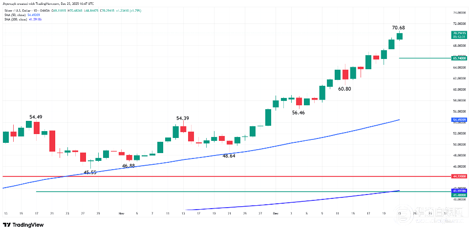 【华通白银网12月24日】•银价触及创纪录的70.68美元,随后获利了结拉低银价,引发对近期强弱的质疑。 •美国GDP强劲增长4.3%,令白银承压,因交易员重新评估对美联储未来降息的预期。 •美国国债收益率上升降低了投资者对贵金属的兴趣,加剧了白银从历史高点回落的趋势。 收益率上升令贵金属承压 银价延续涨势,但在创纪录高位后回落 (白银日线图) 现货白银周二走高,但从70.68美元的新纪录回落,因交易商在周三有限交易和周四圣诞假期前获利了结。 早盘中段,银价徘徊在69.38美元附近,市场正在重新评估,试图辨别这是白银已经疲软的表现,还是强劲涨势的暂停。强劲的工业和投 资需求、库存收紧、地缘政治紧张局势,以及对美国进一步降息的持续预期,推动美元在盘中一度升穿70美元。格林尼治标准时间 16:43,白银价格为70.33美元,上涨1.27美元,涨幅1.84%。 美国经济增长数据强劲后获利了结 在美国GDP数据令整体利率前景复杂化之后,这种逆转开始了。推迟公布的报告显示,美国经济第三季度增长4.3%,远高于3.2%的预 期。消费者支出增长3.5%,出口增强,企业利润激增1661亿美元。 通胀数据喜忧参半,但仍高于美联 ...