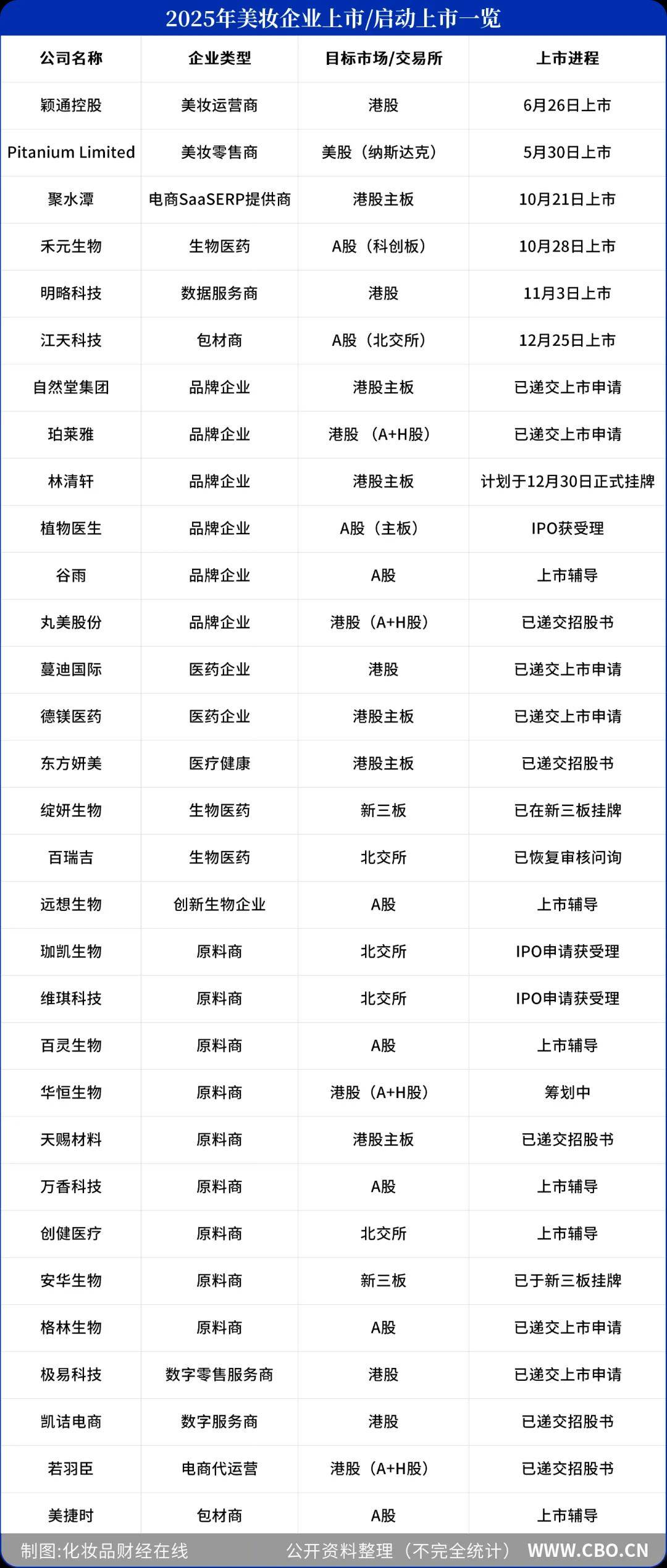 2025年,中国美妆行业的资本化进程呈现出一场结构性的"群体迁徙"。CBO根据公开信息统计,超过30家产业链企业密集涌向全球各大交易所,从上游原 料到下游零售,全产业链集体叩响资本市场大门。 这并非简单的融资热潮,而是行业在流量见顶后,向"硬科技"与"全球化"要增长的一次集体宣誓。资本,正以其苛刻的眼光,重新定义产业的估值体系, 从追捧营销爆款,转向青睐技术壁垒与品牌韧性。 据不完全统计,截至2025年底,美妆产业链已有5家企业成功上市,另有超过25家处于上市进程中的不同阶段。这场资本化运动呈现出清晰的产业链全覆 盖特征: | | | 2025年美妆企业上市/启动上市一览 | | | --- | --- | --- | --- | | 公司名称 | 企业类型 | 目标市场/交易所 | 上市进程 | | 颖通控股 | 美妆运营商 | 港股 | 6月26日上市 | | Pitanium Limited | 美妆零售商 | 美股(纳斯达克) | 5月30日上市 | | 聚水潭 | 电商SaaSERP提供商 | 港股主板 | 10月21日上市 | | 禾元生物 | 生物医药 | A股 (科创板) | 10月28日上市 ...