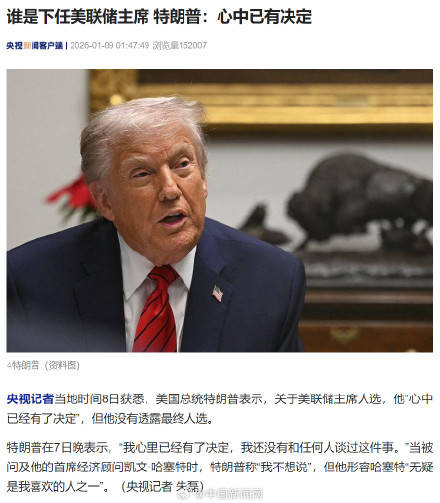 特朗普在上一届总统任期内,于2017年11月2日提名现任美联储主席鲍威尔出任这个职位。之后在民主党前总统拜 登任期内,鲍威尔获提名连任,按计划将于2026年5月结束任期。 特朗普在2025年就任总统后,多次批评鲍威尔降息不及时,并威胁要更换美联储主席。去年11月30日,特朗普表 示,他已经敲定下一任美国联邦储备委员会主席人选,但未透露是谁。有分析指出,无论候选人是谁,特朗普最 看重此人是否对自己忠诚,以实现他要求美联储降息的目的。特朗普12月29日说,他预计2026年1月宣布美联储主 席人选。 责编:李文玉 | 审核:李震 | 监审:古筝 (来源:央视新闻客户端) △特朗普(资料图) 央视记者当地时间8日获悉,美国总统特朗普表示,关于美联储主席人选,他"心中已经有了决定",但他没有透露 最终人选。 特朗普在7日晚表示,"我心里已经有了决定,我还没有和任何人谈过这件事。"当被问及他的首席经济顾问凯文· 哈塞特时,特朗普称"我不想说",但他形容哈塞特"无疑是我喜欢的人之一"。 ...