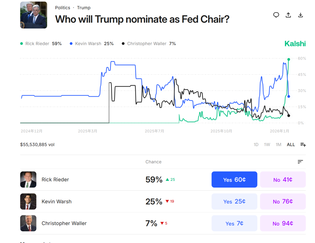 其他竞争者包括:白宫国家经济事务主任凯文·哈塞特、美联储理事克里斯·沃勒,以及前美联储官员凯 文·沃什。 本周出席达沃斯世界经济论坛的企业高管和投资者也在私下表达了对里德尔的支持。 (原标题:大反转!美联储,突发!) 【导读】预测市场交易员押注里克·里德尔将担任美联储主席 中国基金报记者 泰勒 大家好,简单关注一 下美联储下一任主席的消息,出现了大反转,此前的热门人选,出现重大变化! 预测市场的交易员们对下一任美联储主席有了新的"头号人选":贝莱德的高管里克·里德尔(Rick Rieder)。 据悉,里德尔在华尔街的从业经验,以及他对推动央行改革持开放态度,提升了他竞逐该职位的可能性 之后,里德尔的胜算随之上升。 这位资产管理巨头的固定收益首席投资官,已从前美联储理事凯文·沃什手中夺回第一位置。根据预测 市场平台Kalshi上的交易员数据,里德尔被提名担任该职位的概率约为60%,而沃什为25%。 知情人士称,这位贝莱德的高管不仅被认为"很像"一名央行官员的形象,同时他提出的一系列改造美联 储的想法也引起了特朗普的注意。 对里德尔有利的另一点是:与另外的入围者不同,他从未在美联储工作过,因此被认为不受该机构"体 ...