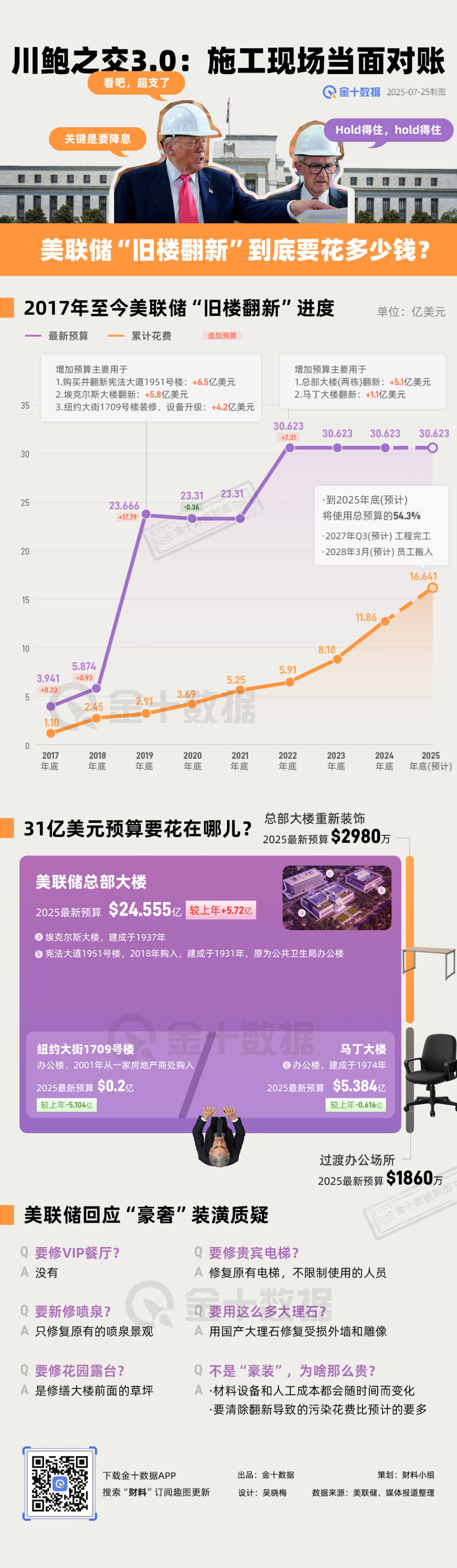 财料 美联储31亿旧楼翻新,预算一涨再涨。特朗普鲍威尔工地对账,看看钱都花哪儿了…… 2025最新预算 $2980万 美联储总部大楼 2025最新预算 $24.555亿 较上年+5.72亿 6 埃克尔斯大楼,建成于1937年 0 宪法大道1951号楼,2018年购入,建成于1931年,原为公共卫生局办公楼 纽约大街1709号楼 马丁大楼 办公楼,2001年从一家房地产商处购入 © 办公楼,建成于1974年 $5.384亿 2025最新预算 $0.2亿 2025最新预算 较上年-5.104亿 较上年-0.616亿 过渡办公场所 2025最新预算 $1860元 美联储回应"豪奢"装潢质疑 10 8.18 5 874 5.91 +0.93 3941 5.25 +0.33 3 89 5 74.9 2 45 0 2018 2019 2023 2024 2025 2017 2020 2021 2022 年底 年底 年底 年底 年底 年底 年底 年底 年底(预计) 31亿美元预算要花在哪儿? | 出品:金十数据 | 策划:财料小组 | | --- | --- | | 设计:吴晓梅 | 数据来源:美联储、媒体报道整理 | 相 ...