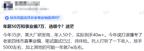 在大厂做研发岗,年薪 50 万,到手 40 万 +,这无疑是一份令人艳羡的高薪工作,它代表着在大城市里 拼搏奋斗的成果,也意味着更多的机会和广阔的发展空间。可是高强度的工作节奏、巨大的竞争压力也 如影随形。 而老家四线城市的市直事业编,一年收入 7 万左右,虽与大厂薪资相差甚远,但胜在稳定,能给予人一 份踏实与安心,还能兼顾家庭。一边是充满挑战与机遇的大厂高薪,一边是平淡安稳的老家事业编,这 看似简单的选择,实则关乎着未来的生活走向。如果是你,会如何在这两者之间权衡利弊,做出让自己 不后悔的决定呢? 有人说:算了下整体收入对比。 企业如果再干5年到40岁,工资40*5=200,裁人补偿8个月8*4=32,股票兑现8*5=40,估计总共270w 去体制内,63岁退休,还能干28年,估计总共280w 两者算起来收入差不多。 在企业干到五年能抵体制内干到退休。40岁后随便搞点其他的哪怕没收入,好像也能抵体制内到退休。 但就是不知道能干到五年不。体制内那份工作加班也非常多,招商引资,周六周日都不一定能休息,好 像性价比也不高 有网友说:30岁的话我会劝你继续在大厂干,35岁的话,回家别犹豫,错过这村没这店了 有人说: ...