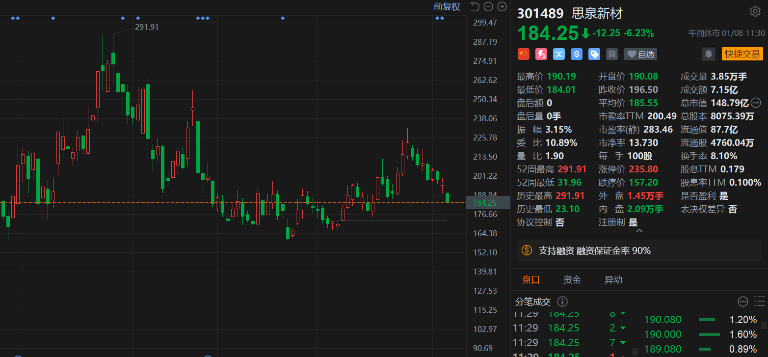 A股异动丨股东拟减持,思泉新材午间收跌6.23%,市值跌破150亿元