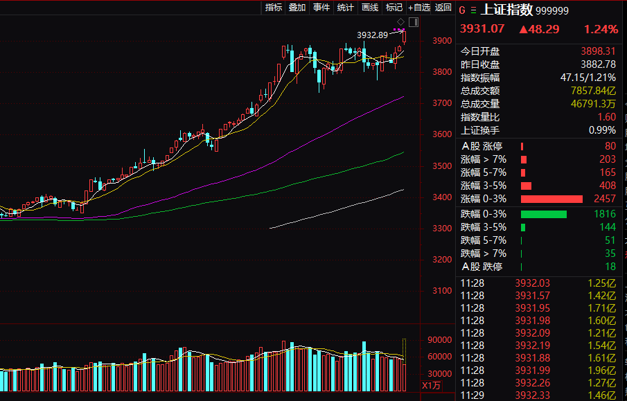 国庆后首个交易日上午,A股市场整体进一步上行,上证指数时隔10年突破3900点。截至午间收盘,沪指涨1.24%,深成指涨 1.75%,创业板指涨1.77%。 有色金属股和芯片股大涨,成为上午A股市场两大主线,推动市场上行。 港股市场方面,因私有化消息推动,恒生银行出现暴涨,盘中涨幅一度超过40%。 沪指时隔10年突破3900点 10月9日,A股市场整体进一步上行。上证指数盘中向上突破3900点,为时隔10年首次突破3900点整数关口。 | 指标 叠加 事件 统计 出版圖 | 标记 +自选 返回 | G = 上证指数 999999 | | | --- | --- | --- | --- | | | 3931.07 3900 | A48.29 | 1.24% | | | 今日开盘 | | 3898.31 | | | 昨日收盘 | | 3882.78 | | | 3800 指数振幅 | | 47.15/1.21% | | | 总成交额 | | 7857.84Z | | | 3700 总成交量 | | 46791.3万 | | | 指数量比 | | 1.60 | | | 上证换手 3600 | | 0.99% | | ...