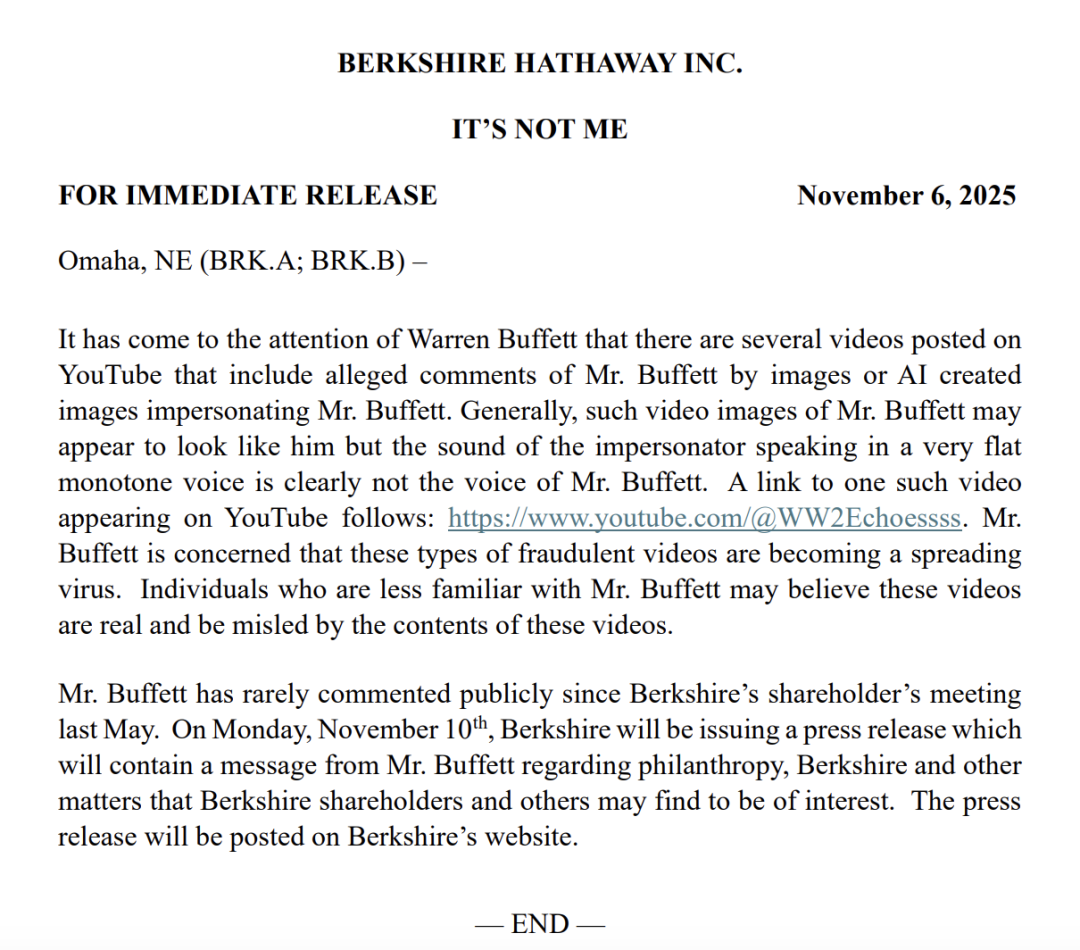 巴菲特最新。 近日,美国著名投资人巴菲特执掌的伯克希尔.哈撒韦公司发表声明,紧急澄清相关视频平台上传播的几段关于巴菲特发表评论的视频。声明称,这些视 频是用人工智能伪造的"欺诈性视频",并非巴菲特本人录制。巴菲特担心,这类欺诈性视频正在成为一种蔓延的病毒。因为,不熟悉巴菲特的人可能会认 为这些视频是真的,并被这些视频的内容误导。 值得注意的是,该声明稿还透露,11月10日(周一),伯克希尔将发布一份新闻稿,其中将包含巴菲特关于慈善事业、伯克希尔及其他伯克希尔股东和相关 人士可能感兴趣的事项的声明。 自今年5月伯克希尔公司股东大会召开以来,巴菲特极少公开发表评论。当时巴菲特宣布了一项重要决定——计划在年底退休,并提请董事会批准格雷格. 阿贝尔正式接任CEO职位。届时,巴菲特将结束其在伯克希尔长达六十年的领导生涯。 据媒体报道称,巴菲特今年将不再撰写备受全球投资者追捧的年度致股东信,这一重任已移交其继任者、副董事长格雷格.阿贝尔。这位95岁的亿万富翁 仍将于11月10日发布致子女与股东的感恩节信函。 当地时间11月1日,伯克希尔公布了巴菲特卸任CEO之前发布的最后一份财务报告。财报显示,伯克希尔公司第三季度的营收 ...
