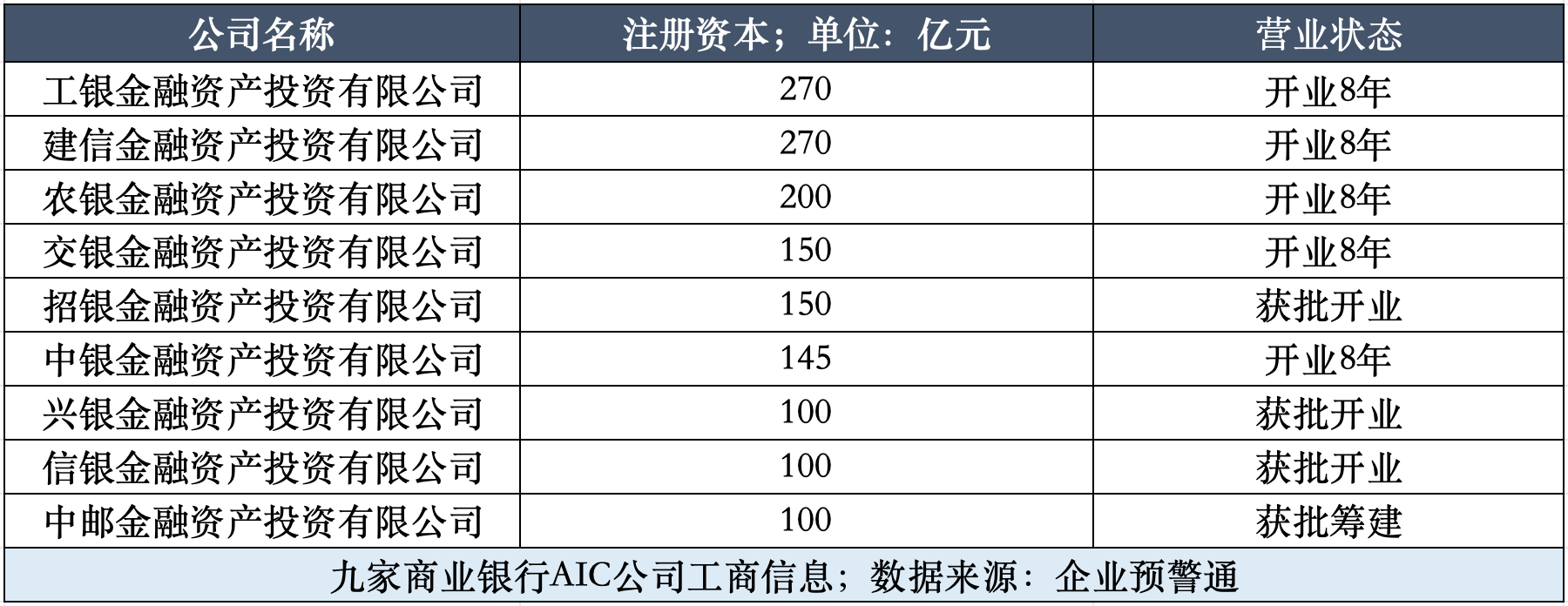 截至11月24日,全国商业银行AIC已扩容至9家,其中8家已获准开业; 11月23日,招商银行、中信银行两家股份行同日公告,旗下AIC(金融资产投资公司)已获得金融监管总局开业批复; 加之不久前开业的兴银投资,年内AIC 市场已有三位新玩家正式下场。 回顾来看,本轮AIC公司发起节奏较快: 今年3月,监管发布扩大AIC股权投资试点通知,为商业银行设立AIC打开政策通道: 随后兴业银行、中信银行、招商银行分别在5-7月陆续获批筹建AIC,邮储银行亦在10月收获监管筹建批复。 截止11月24日,全国AIC股权投资企业(含直接与间接)已达629家,其中持股层级一级、二级、三级占比分别为62.9%、29.5%、7.1%; 因设立时有100亿元的实缴门槛,且后期业务资源对接高度依赖母行,目前进入AIC赛道的玩家仍是不折不扣的大行,行业注册资金规模已接近1500亿元。 | 公司名称 | 注册资本;单位:亿 | | --- | --- | | 工银金融资产投资有限公司 | 270 | | 建信金融资产投资有限公司 | 270 | | 农银金融资产投资有限公司 | 200 | | 交银金融资产投资有限公司 | 150 | | ...