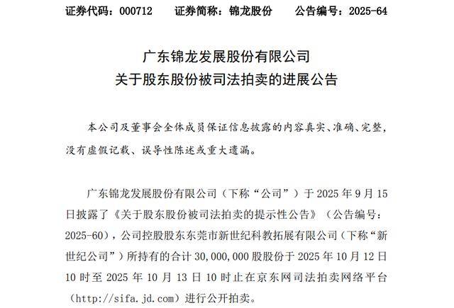 今(13)日下午,锦龙股份(SZ000712)披露《关于股东股份被司法拍卖的进展公告》,公司控股股东东莞市新世纪科教拓展有限公司(下称"新世纪公 司")所持有的合计3000万股股份于10月12日10时至10月13日10时止在京东网司法拍卖网络平台进行公开拍卖。 据京东网司法拍卖网络平台信息显示,上述3000万股股份共被拆成10个标的拍卖,每个标的均为300万股。单个标的起拍价为3138.45万元,该价格是以10 月10日前二十个交易日的收盘价均价下浮30%确定。 根据京东网司法拍卖网络平台发布的《成交确认书》,成都金耀壹号企业管理合伙企业(有限合伙)(下称"成都金耀壹号")以合计2.62亿元的成交价竞得 2100万股,根据锦龙股份截至6月末的前十大股东情况,该竞买人有可能成为公司第五大股东。此外,自然人陈瑞岳以3753.45万元竞得300万股;自然人 王梅耳以3683.45万元的成交价竞得300万股;自然人史幼君以3893.45万元的成交价竞得300万股。 据川商传媒记者计算,锦龙股份此次被拍卖的3000万股股份最终总成交金额达3.76亿元,相比3.14亿元的起拍总价溢价近20%,折合每股价格约为12.53 ...