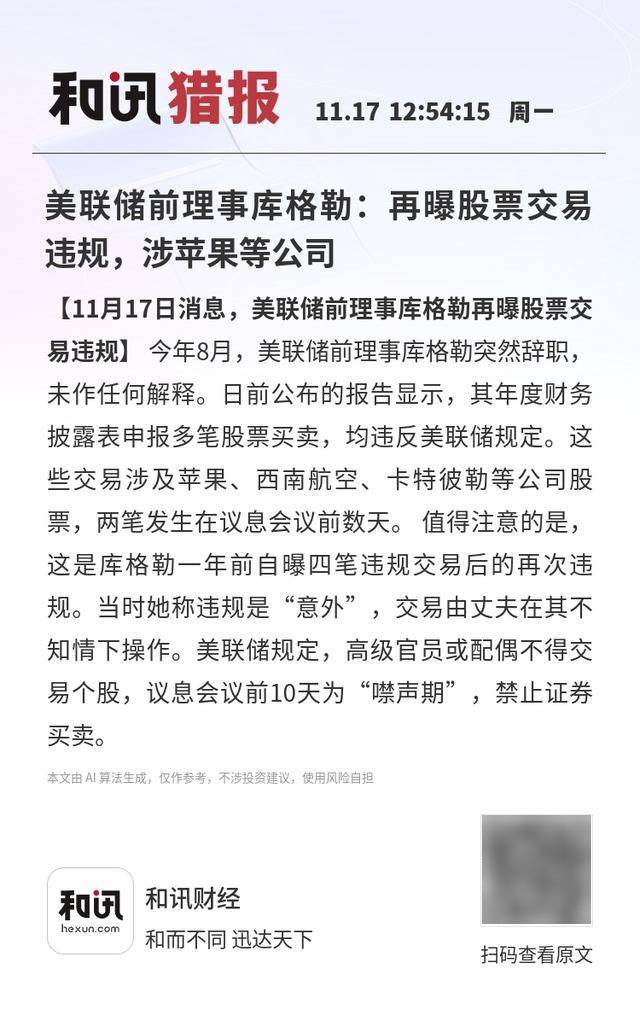 Core Viewpoint - Former Federal Reserve Governor Kugar's stock trading violations have been revealed, raising concerns about compliance with Federal Reserve regulations [1] Summary by Relevant Categories Violations and Regulations - Kugar reported multiple stock trades in her annual financial disclosure, violating Federal Reserve rules that prohibit senior officials and their spouses from trading individual stocks [1] - The trades involved companies such as Apple, Southwest Airlines, and Caterpillar, with two transactions occurring just days before a Federal Open Market Committee meeting [1] - This incident follows Kugar's previous admission of four violations a year ago, which she attributed to "accidental" trades executed by her husband without her knowledge [1] Timeline and Context - Kugar unexpectedly resigned in August without providing an explanation [1] - Federal Reserve regulations impose a "quiet period" of 10 days before interest rate meetings during which trading is prohibited [1]