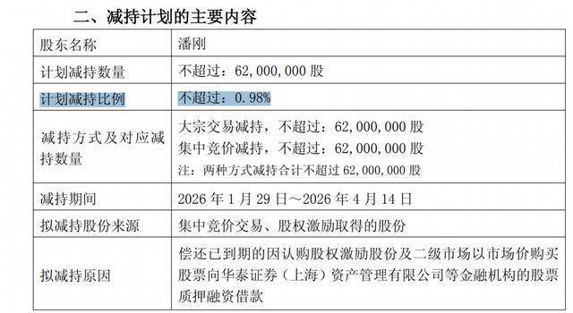 东方财富数据显示,2020年至2024年,潘刚薪酬分别为2149万元、2296万万元、2573万元、2179万元、 1974万元。 伊利股份成立于1993-06-04,法定代表人为潘刚,注册资本为63.66亿元,经营范围包含:乳制品生产; 婴幼儿配方食品生产;食品销售等。该公司大股东为呼和浩特投资有限责任公司,持股8.51%。 2025年前三季度,伊利股份营业收入为903.41亿元,同比增长1.81%;归母净利润为104.26亿元,同比 下降4.07%。 截至本公告披露日,潘刚持有公司股份2.87亿股,占公司总股本的4.53%。 | 股东名称 | 潘刚 | | --- | --- | | 计划减持数量 | 不超过:62,000,000 股 | | 计划减持比例 | 不超过:0.98% | | 减持方式及对应减 持数量 | 大宗交易减持,不超过:62,000,000 股 集中竟价减持,不超过:62,000,000 股 | | | 注:两种方式减持合计不超过 62,000,000 股 | | 减持期间 | 2026年1月29日~2026年4月14日 | | 拟减持股份来源 | 集中竞价交易、股权激励取得的股份 | ...
