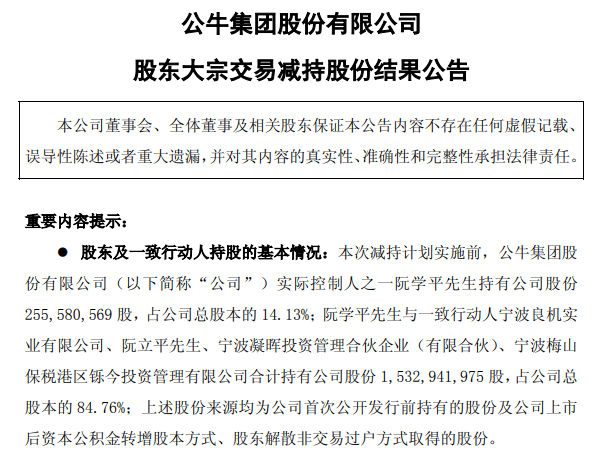 Group 1 - The major shareholder of Bull Group, Ruan Xueping, completed a significant share reduction plan, selling approximately 36.17 million shares, which accounts for 2.00% of the company's total equity, for a total amount of about 1.456 billion yuan within just half a month [1] - The share reduction plan was announced on October 9, and it was completed rapidly, with Ruan citing personal funding needs as the reason for the sale [1] - Following the initiation of the share reduction on October 31, the discount rate for block trades of the stock has been increasing, starting at 5.91% and reaching 9% by November 14 [1] Group 2 - Ruan Xueping, along with his co-controlling shareholder, holds approximately 1.533 billion shares of Bull Group, representing 84.76% of the total equity, indicating a strong controlling position [2] - In the first three quarters of the year, Bull Group reported a decline in both revenue and net profit, with revenue at 12.198 billion yuan, down 3.22% year-on-year, and net profit at 2.979 billion yuan, down 8.72% year-on-year [2]