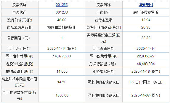 Group 1 - The company, Hai'an Rubber Group Co., Ltd., is set to issue shares at a price of 48.00 yuan per share, with an expected total fundraising amount of approximately 223.168 million yuan [1][2] - The company aims to use the raised funds for expanding production capacity of giant all-steel radial tires, upgrading automated production lines, constructing a research and development center, and supplementing working capital [2] - The company is controlled by Xinhui Group, which holds 28.32% of the shares, while the actual controller, Zhu Hui, directly holds 19.50% and indirectly through Xinhui Group holds a total of 47.82% [2] Group 2 - The company operates in the rubber and plastic products industry, with a reference industry price-earnings ratio of 26.38, while its own issuance price corresponds to a price-earnings ratio of 13.94 [1] - The total number of shares to be issued is 46,493,334, with 14,877,500 shares available for online subscription and 22,835,627 shares for offline allocation [1] - The expected net fundraising amount after deducting estimated issuance costs of approximately 12.415 million yuan is about 210.753 million yuan [2]