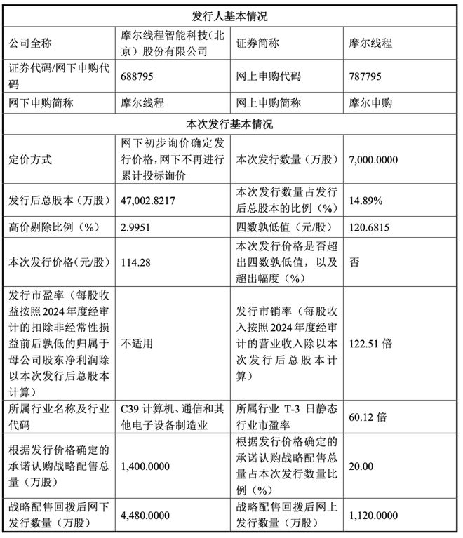 Core Points - Moore Threads announced its initial public offering (IPO) and listing on the Sci-Tech Innovation Board, with a total of 70 million shares to be issued [1] - The offering price is set at 114.28 yuan per share, aiming to raise a total of 8 billion yuan, with a net amount expected to be 7.576 billion yuan after deducting issuance costs [1] Company Information - Full company name: Moore Threads Intelligent Technology (Beijing) Co., Ltd [2] - Stock code for offline subscription: 688795; online subscription code: 787795 [2] - The total number of shares after the issuance will be approximately 47,002.82 million shares, with the new issuance accounting for 14.89% of the total [2] Issuance Details - The pricing method is based on preliminary inquiries for offline subscriptions, with no further inquiries conducted [2] - The expected total fundraising amount is approximately 799.96 million yuan [3] - Important dates include the offline and online subscription date on November 24, 2025, and the payment deadline on November 26, 2025 [3]