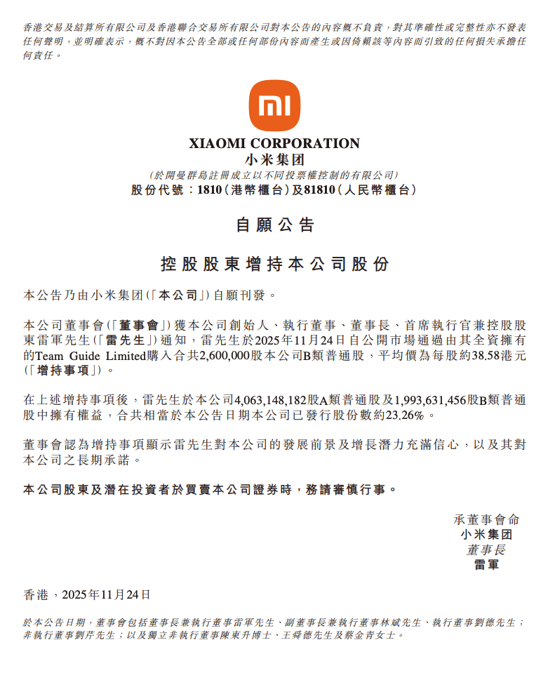 11月24日,小米集团于港交所发布公告披露,小米集团创始人、董事长兼CEO雷军个人斥资超1亿港元增持小 米集团260万股,其个人持股比例增加至23.26%。 小米集团董事会认为,增持事项显示雷军对公司的发展前景及增长潜力充满信心。 图源:港交所 本月,小米集团连续两日大手笔回购公司股票,总金额超8亿港元。今年以来,小米集团累计回购金额已超23 亿港元。 11月18日,小米集团发布业绩公告:2025年第三季度实现营收约1131.21亿元,同比增长22.3%,连续4个季度突 破千亿元;经调整净利润为113亿元,创历史新高,同比增长80.9%。 11月20日,第50万辆小米汽车正式下线,创全球新能源车企50万辆下线的最快纪录。当天,雷军发微博长文表 示:"行胜于言、以行践言,我们会用行动向大家交出更好的答卷。" (流程编辑:U072) ...