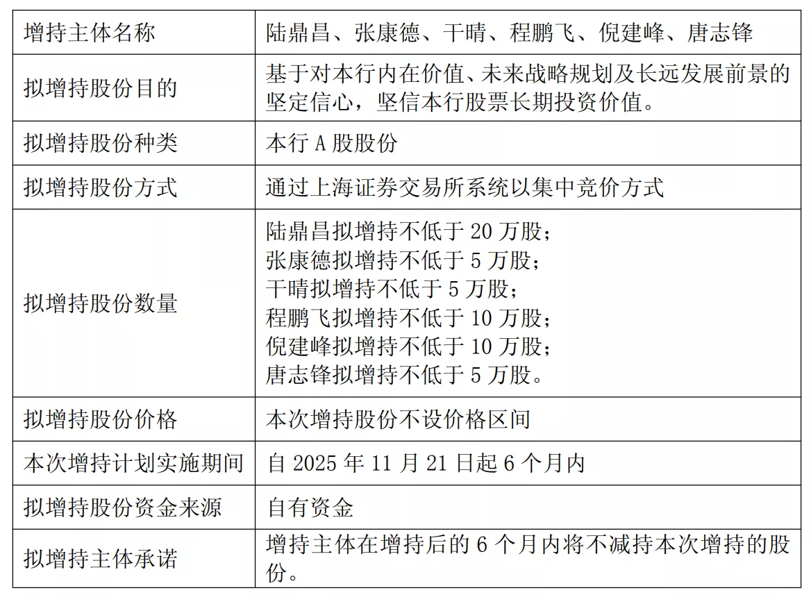 | 增持主体名称 | 陆鼎昌、张康德、干晴、程鹏飞、倪建峰、唐志锋 | | --- | --- | | 拟增持股份目的 | 基于对本行内在价值、未来战略规划及长远发展前景 | | | 坚定信心,坚信本行股票长期投资价值。 | | 拟增持股份种类 | 本行 A 股股份 | | 拟增持股份方式 | 通过上海证券交易所系统以集中竞价方式 | | 拟增持股份数量 | | | | 陆鼎昌拟增持不低于 20万股; 张康德拟增持不低于 5万股; | | | 干晴拟增持不低于 5万股; | | | 程鹏飞拟增持不低于 10万股; | | | 倪建峰拟增持不低于 10万股; | | | 唐志锋拟增持不低于5万股。 | | 拟增持股份价格 | 本次增持股份不设价格区间 | | 本次增持计划实施期间 | 自 2025 年 11 月 21 日起 6 个月内 | | 拟增持股份资金来源 | 自有资金 | | 拟增持主体承诺 | 增持主体在增持后的6个月内将不减持本次增持的 | | | 份。 | (常熟银行) 11月20日,常熟银行(601128)发布公告称,基于对该行内在价值、未来战略规划及长远发展前景的坚定信心,坚信该行股票长期投资 ...