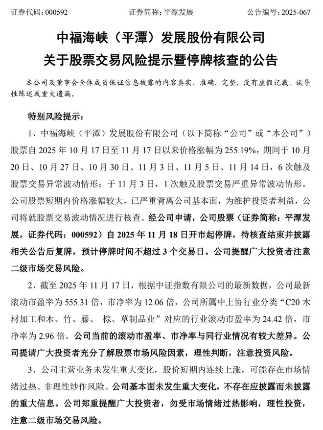 11月17日晚间,平潭发展晚间公告,公司股票自2025年10月17日至11月17日以来价格涨幅为255.19%, 期间6次触及股票交易异常波动情形,1次触及股票交易严重异常波动情形。公司股票自2025年10月17日 至11月17日以来价格涨幅为255.19%,严重背离公司基本面。经公司申请,公司股票自2025年11月18日 开市起停牌,待核查结束并披露相关公告后复牌,预计停牌时间不超过3个交易日。 盘面上,17日,平潭发展延续狂热涨势,再度一字涨停,报11.97元/股。自10月17日上涨启动,该股走 出"21天13板"行情,股价累计涨幅255.19%,总市值从65亿飙升至231亿。 编辑丨钉钉 ...