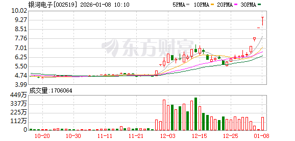 银河电子盘中涨停,已连收4个涨停板,截至9:25,该股报9.48元,换手率1.84%,成交量2056.28万股, 成交金额1.95亿元,涨停板封单金额为6598.63万元。连续涨停期间,该股累计上涨46.30%,累计换手 率为19.68%。最新A股总市值达106.79亿元,A股流通市值106.06亿元。 证券时报·数据宝统计,两融数据来看,该股最新(1月7日)两融余额为4.17亿元,其中,融资余额4.17 亿元,较前一个交易日增加202.43万元,环比增长0.49%,近4日累计增加1.78亿元,环比增长74.29%。 龙虎榜数据显示,该股因连续三个交易日内,涨幅偏离值累计达20%上榜龙虎榜1次,买卖居前营业部 中,机构净卖出1130.66万元,深股通累计净买入145.34万元,营业部席位合计净买入1.76亿元。(数据 宝) 近日该股表现 | 日期 | 当日涨跌幅(%) | 换手率(%) | 主力资金净流入(万元) | | --- | --- | --- | --- | | 2026.01.07 | 9.95 | 1.35 | 1909.14 | | 2026.01.06 | 9.96 | 5.70 | 420 ...