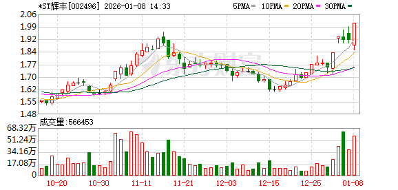 (文章来源:证券时报网) | 日期 | 当日涨跌幅(%) | 换手率(%) | 主力资金净流入(万元) | | --- | --- | --- | --- | | 2026.01.07 | 0.00 | 3.38 | -530.35 | | 2026.01.06 | -1.04 | 5.70 | -1299.33 | | 2026.01.05 | 4.89 | 3.83 | 15.11 | | 2025.12.31 | 5.14 | 2.19 | 348.36 | | 2025.12.30 | -1.69 | 1.21 | -815.52 | | 2025.12.29 | 0.00 | 1.32 | -8.73 | | 2025.12.26 | 0.56 | 1.61 | 160.53 | | 2025.12.25 | 2.91 | 1.22 | 353.47 | | 2025.12.24 | 1.78 | 0.66 | 286.40 | | 2025.12.23 | -1.17 | 0.70 | -112.39 | 近日该股表现 *ST辉丰再度涨停,5个交易日内录得3个涨停,累计涨幅为14.86%,累计换手 ...