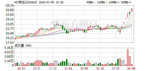 *ST声迅再度涨停,5个交易日内录得4个涨停,累计涨幅为21.61%,累计换手率为14.90%。截至9:42, 该股今日成交量35.60万股,成交金额964.75万元,换手率0.52%。最新A股总市值达22.30亿元,A股流 通市值18.73亿元。 龙虎榜数据显示,该股因连续三个交易日内,收盘价涨幅偏离值累计达到12%的ST证券、*ST证券上榜 龙虎榜1次,买卖居前营业部中,营业部席位合计净卖出733.00万元。 (文章来源:证券时报网) 公司1月5日在交易所互动平台中披露,截至最新(12月31日)股东户数为5878户,较上期(12月20日) 减少746户,环比下降11.26%。这是该股股东户数连续第5期下降,也就是说筹码呈持续集中趋势。 (数据宝) 近日该股表现 | 日期 | 当日涨跌幅(%) | 换手率(%) | 主力资金净流入(万元) | | --- | --- | --- | --- | | 2026.01.08 | 0.00 | 4.05 | -760.35 | | 2026.01.07 | 5.02 | 7.25 | -223.43 | | 2026.01.06 | 5.02 | 0.60 | 3 ...