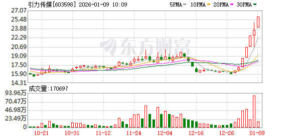 近日该股表现 | 日期 | 当日涨跌幅(%) | 换手率(%) | 主力资金净流入(万元) | | --- | --- | --- | --- | | 2026.01.08 | 4.20 | 32.40 | -553.51 | | 2026.01.07 | 10.02 | 8.35 | 10390.46 | | 2026.01.06 | 10.01 | 18.86 | 11090.77 | | 2026.01.05 | 10.01 | 17.43 | 21715.44 | | 2025.12.31 | 3.47 | 9.17 | -782.76 | | 2025.12.30 | 3.40 | 5.66 | 1080.43 | | 2025.12.29 | -1.98 | 4.09 | -3539.39 | | 2025.12.26 | -0.12 | 2.98 | -186.77 | | 2025.12.25 | -0.43 | 2.72 | -1667.93 | | 2025.12.24 | 0.25 | 2.18 | -867.77 | (文章来源:证券时报网) 引力传媒再度涨停,5个交易日内录得4个涨停 ...